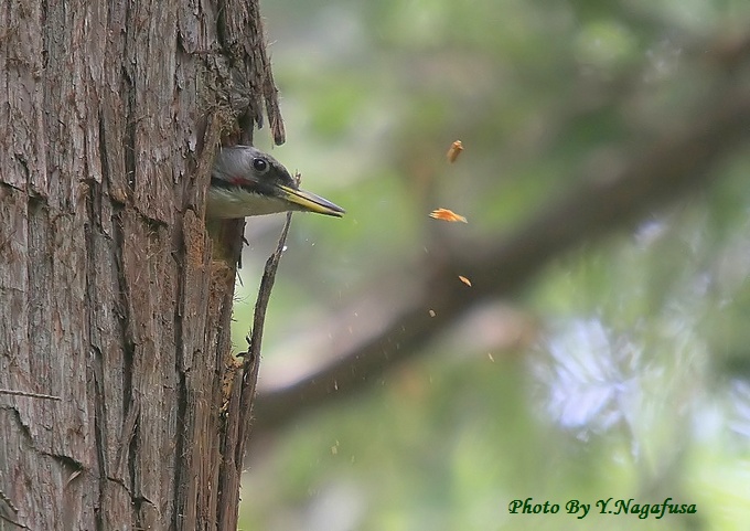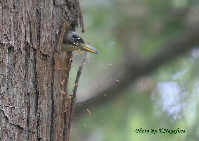 2014年4月27日 アオゲラ 巣作り 本日はキジの♀に出会えました。 4月19日撮影のアオゲラです。 この日巣作り中のアオゲラに出会えました。 木の中でコンコンと音がして少したって木屑を吐き出していました。 アオゲラ♀が巣の外に出て来ました。 巣の中を掘ってから纏めて木屑を飛ばします。