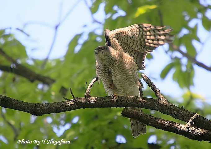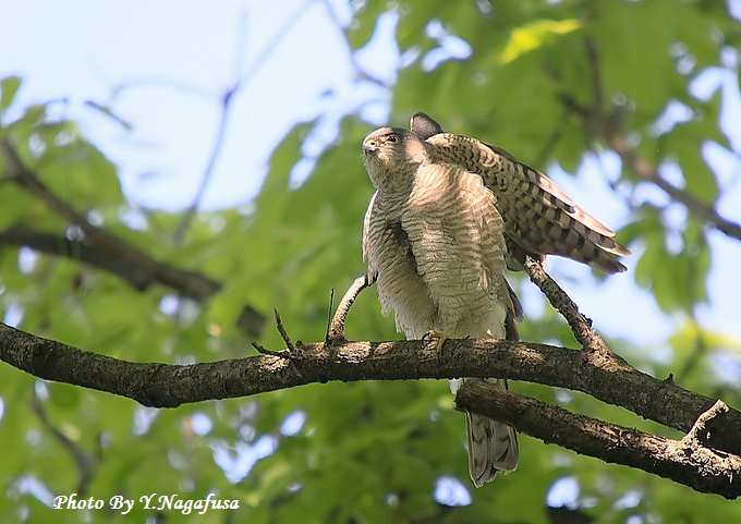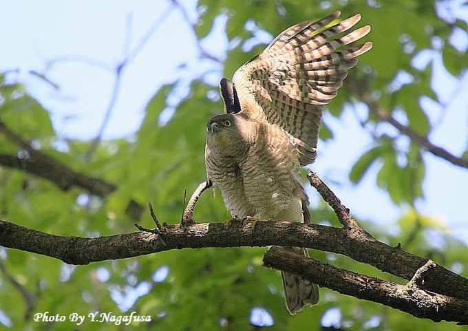 2014年4月28日 ツミ♀1 枝留まり、天使のポーズ 本日はキジ♂に出会えました。 4月23日撮影のツミです。 この日ツミのストレッチや食事やペアリング等を見る事ができました。 天使のポーズをとった時を掲載します。 ツミ♀が近くの枝に来ました。 ストレッチです。 天使のポーズです。