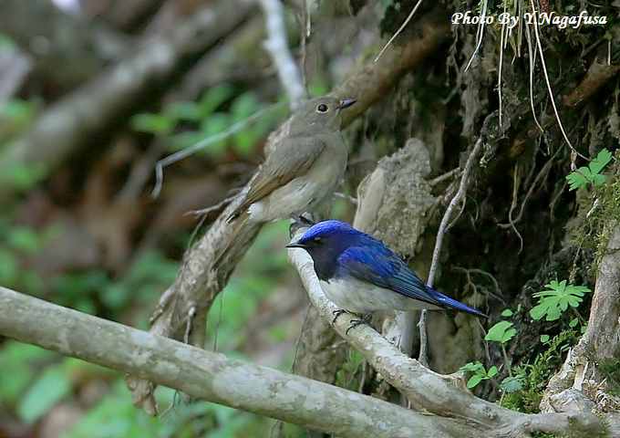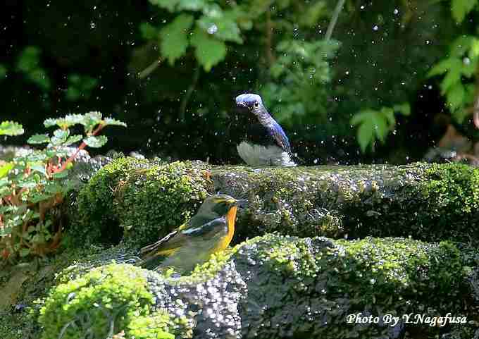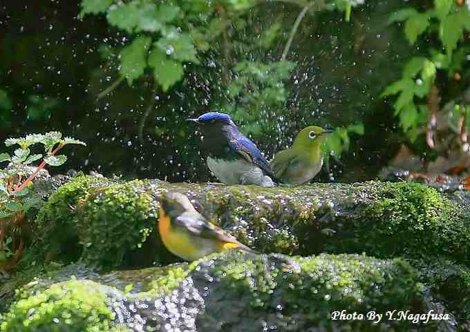 2014年5月22日 オオルリ♂ 留まり物、水浴び 本日はチョウゲンボウの巣立ち雛を見て来た。 5月18日撮影のオオルリ♂他です。 この日水場は混雑し多い時は4種が同時に水浴びしました。 オオルリの♂♀が並びました。 水浴びにキビタキ♂及びメジロと混浴になりました。 オオルリ♂の水浴び後の羽繕いです。