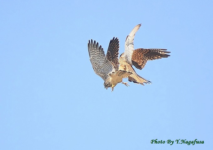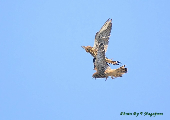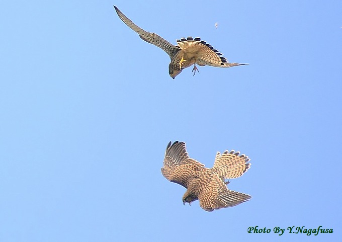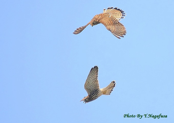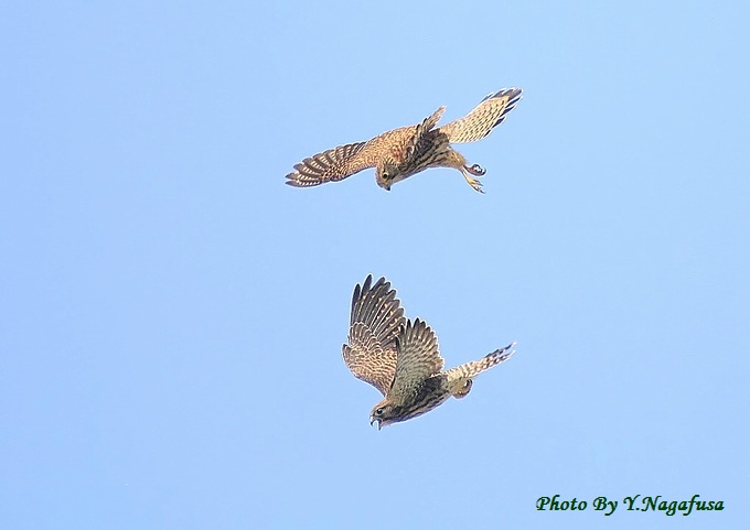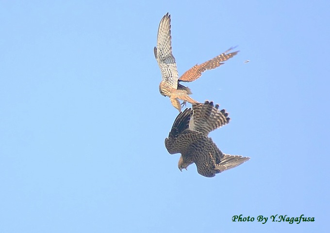 2014年5月26日 チョウゲンボウ雛1 バトル 本日はコアジサシを見て来た。 5月22日撮影のチョウゲンボウ雛です。 この日巣立ちして3日目の雛を見る事ができました。 最初に巣立ちした雛は自由に飛べるようになっています。 空中でバトルをしていました。 チョウゲンボウ雛同士のバトルです。 蹴飛ばしているようです。