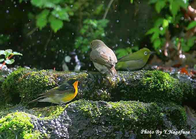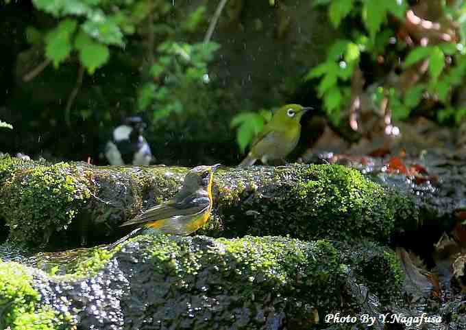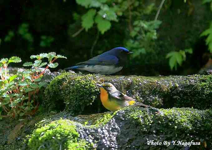 2014年6月8日 キビタキ♂ 留まり物、水浴び 本日も雨。 5月18日撮影のキビタキ♂です。 この日数回水場に来て他の鳥と混浴して行きました。 キビタキ♂が来ました。 水場でオオルリ♀、シジュウカラ、メジロと混浴です。 オオルリ♂とも混浴しました。 水浴び後の羽繕いです。