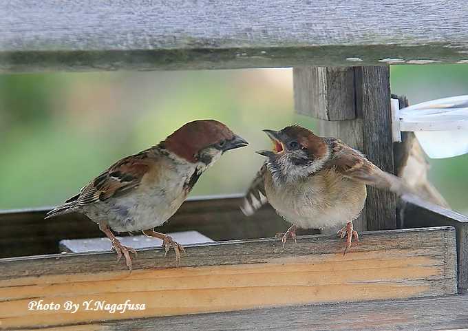 スズメの雛が餌を催促しています。