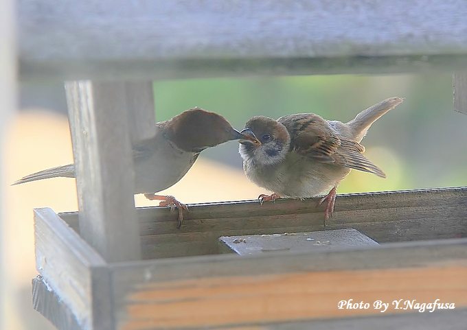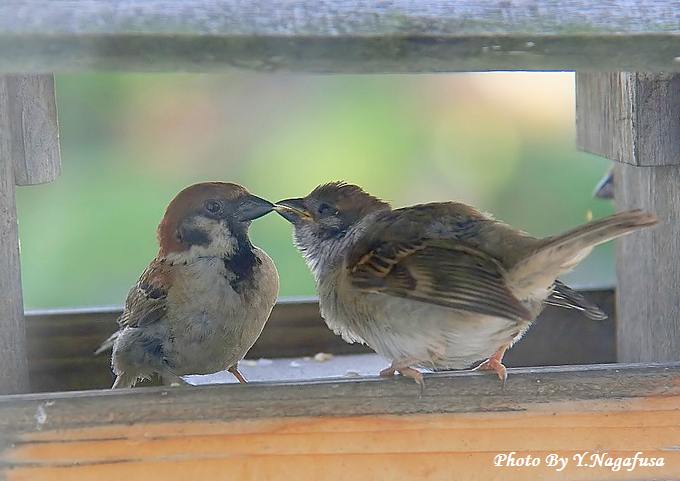 我が家の野鳥の餌台にスズメの親子がやって来ました。