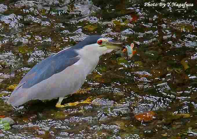 ゴイサギが獲物を狙っています。