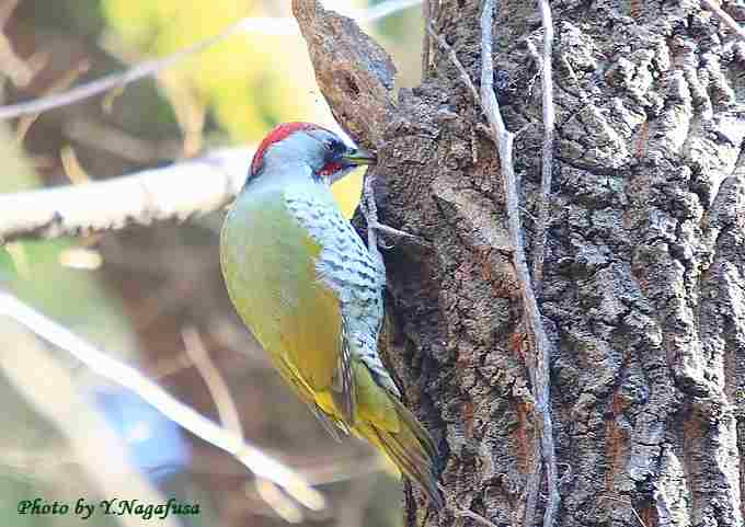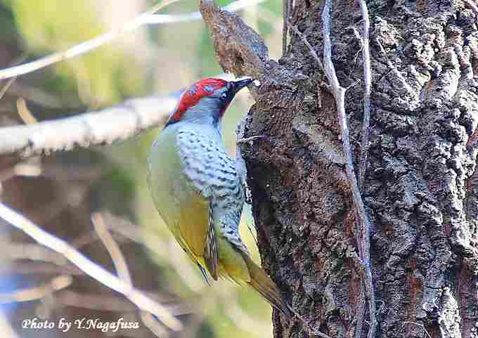 アオゲラ♂が木を突きます。