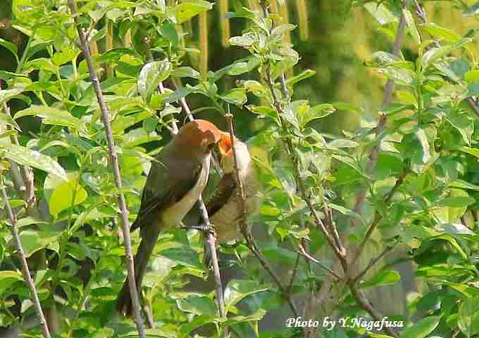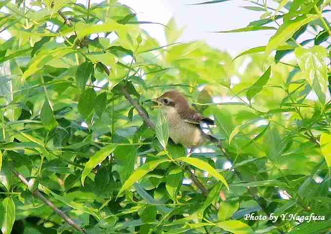 2015年5月9日 モズ雛 親子 本日は曇りのち雨。 昨日撮影のモズの雛です。 葉の陰に隠れて見えるところになかなか出てきてくれません。 少しだけ撮れました。 モズ雛がいました。 給餌場面ですが顔が見えなくて残念。 雛がもっと餌がほしいと鳴いています。