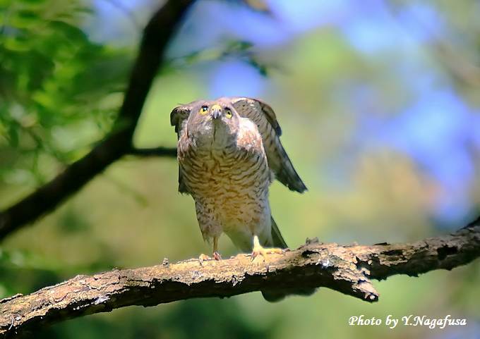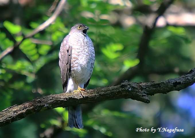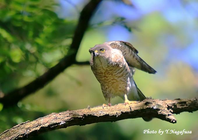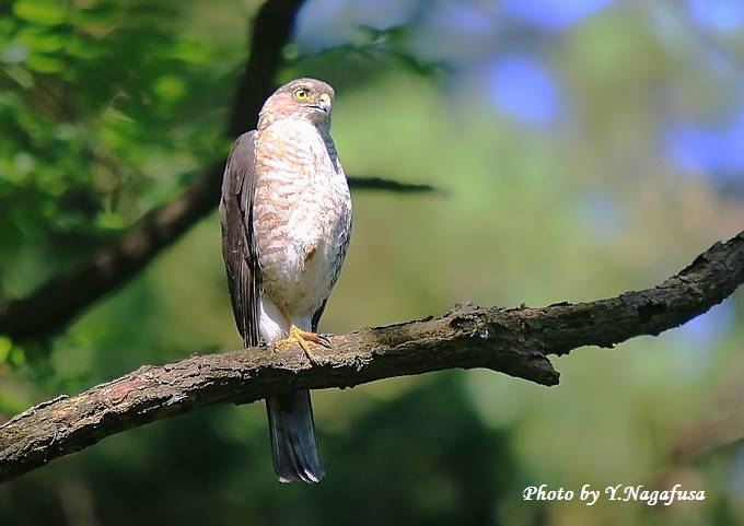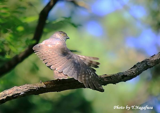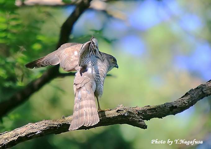 2015年7月2日 ツミ ♀ 枝留まり 本日は雨のち晴れ。 昨日掲載の続きのツミ♀です。 この日、巣立ち雛を見守る母親はあまり動きません。 ♂が餌を持って来るのを待ちます。 ツミ♀が叫んでいます。 ストレッチ。 天使のポーズ。