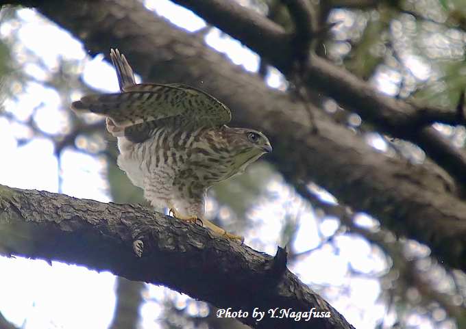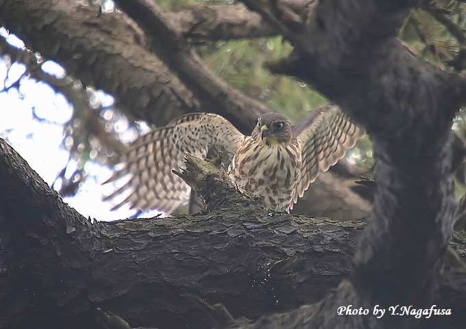 2015年7月10日 ツミ2 巣立ち雛、留まり物 本日は蓮の花を見てきました。 昨日掲載のツミの巣立ち雛の続きです。 雛はあまり遠くには留まらず近くに留まっていました。 ツミの巣立ち雛が並んでいました。 ストレッチ。