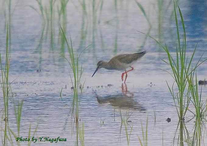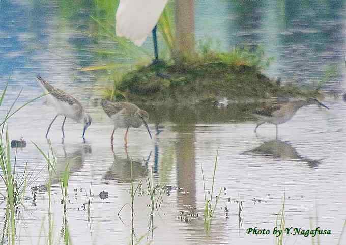2015年9月9日 アカアシシギ 餌捜し 本日は台風。 9月7日撮影のアカアシシギです。 この日、休耕田でアカアシシギを見ることができました。 遠いので綺麗に撮れません。証拠写真です。 アカアシシギが遠くにいました。 中央がアカアシシギ、左右はアオアシシギでしょうか?