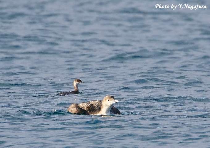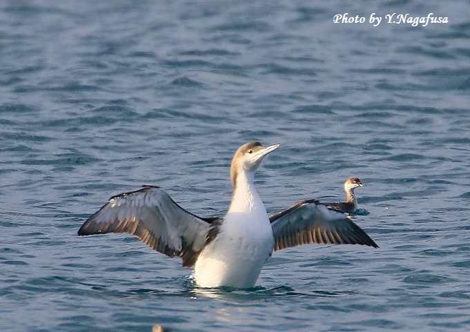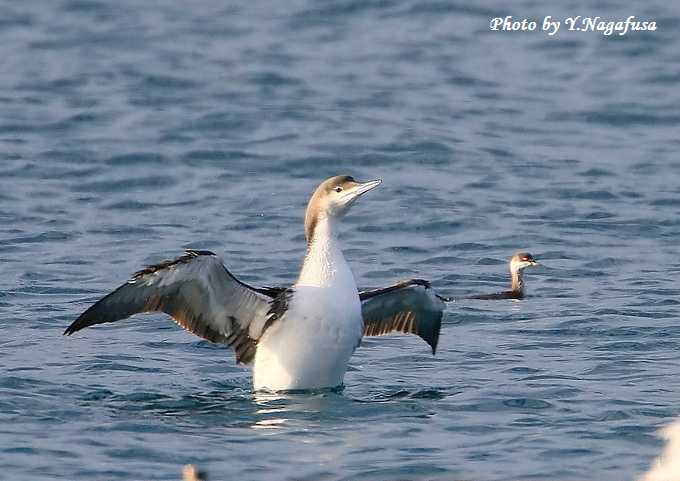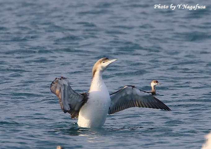 2015年12月30日 オオハム2 羽ばたき 本日は、ルリビタキ♀を見ましたが暗すぎでした。。 12月28日撮影のオオハムの続きです。 この日のオオハムはサービス良くて羽ばたきを10回以上してくれました。 その都度撮ってしまいどの場面を残すか迷いました。 背景にハジロカイツブリが居る場面を掲載します。 オオハムが羽ばたきの姿勢に入りました。