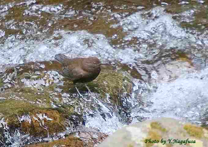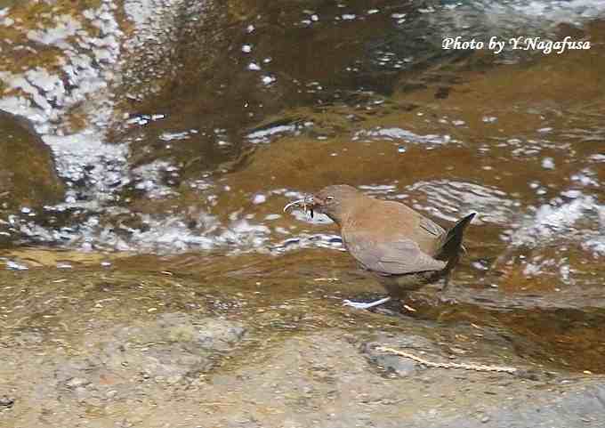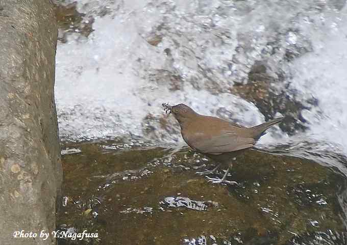 この日、カワガラスが何回も餌を咥えて滝裏の巣穴に運んでいました。