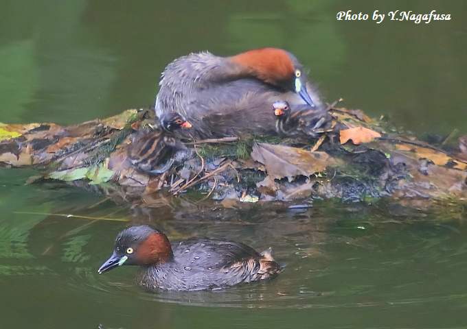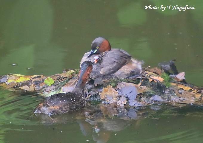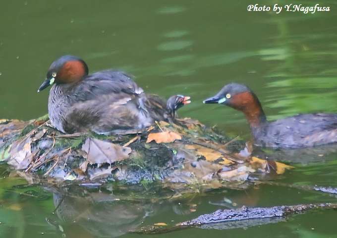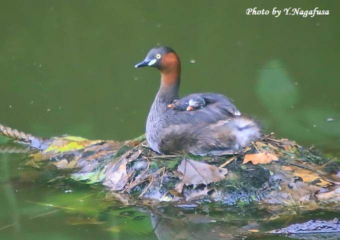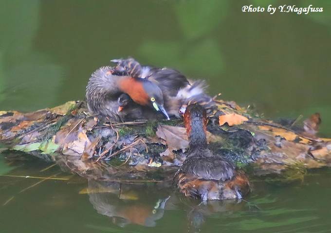 2016年6月29日 カイツブリU 親子 本日は、小雨のち曇り。 6月24日撮影のカイツブリ2番子の続きです。 この日、卵を抱いている親はなかなか卵を見せてくれませんでした。 カイツブリ親子が最後の卵の孵化待ちです。 先に孵化した雛は親の背中で寝ています。 雛3羽が見えました。