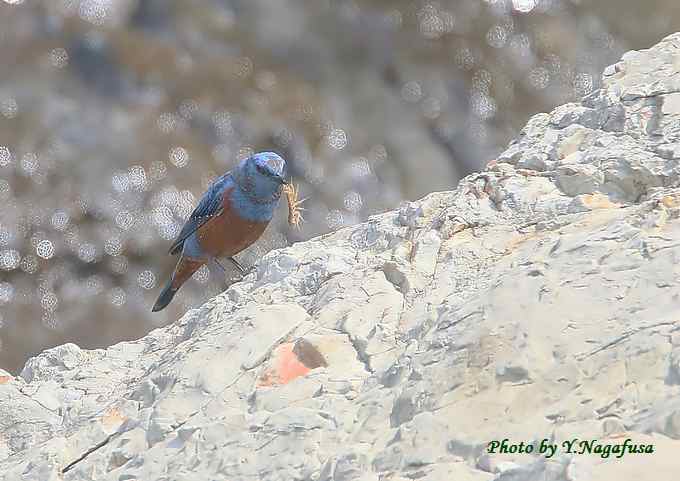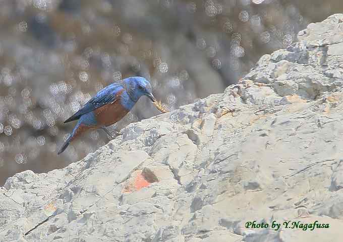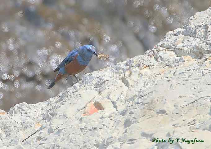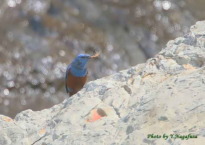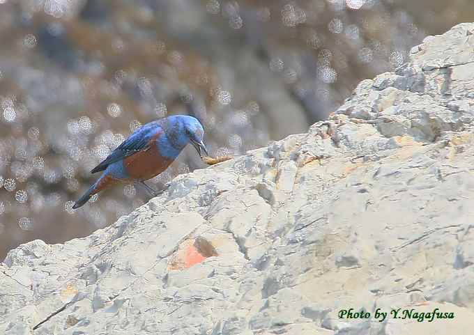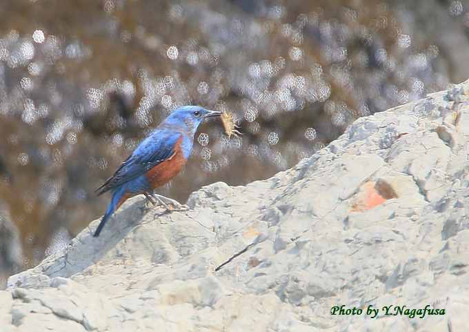 2017年4月4日 イソヒヨドリ 採餌 本日は、桜カワセミ撮れませんでした。 3月29日撮影のイソヒヨドリです。 この日、イソヒヨドリの採餌場面が撮れました。 獲物はフナムシでしょうか? イソヒヨドリ♂が獲物を咥えていました。