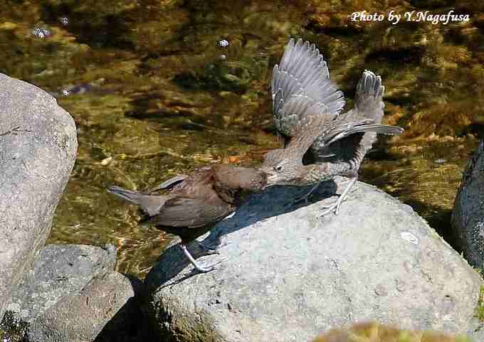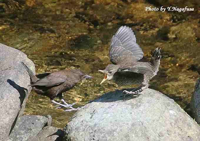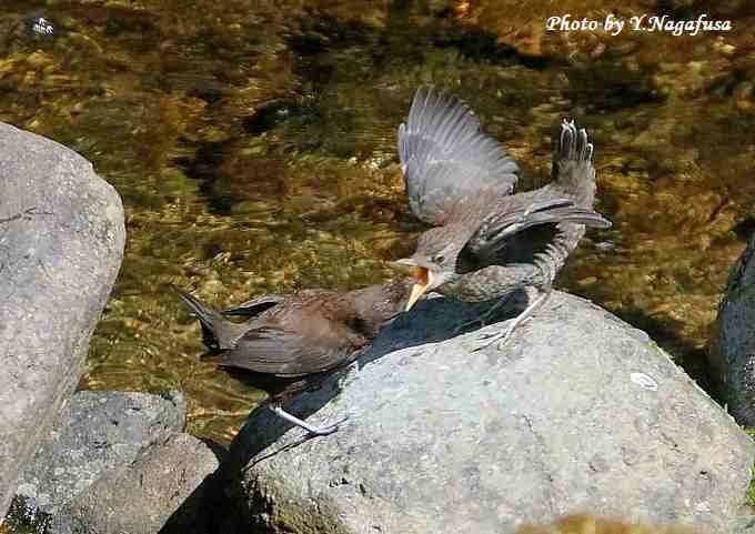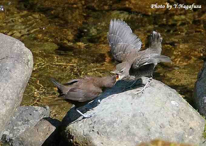 2017年4月28日 カワガラスU 給餌 本日は、自主練で鳥撮りは休み。 4月14日撮影のカワガラスの続きです。 この日、日向で雛に給餌する場面が数回ありました。 カワガラス雛(右)に親(左)が餌を持って来ました。