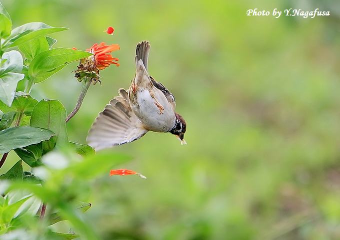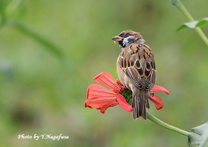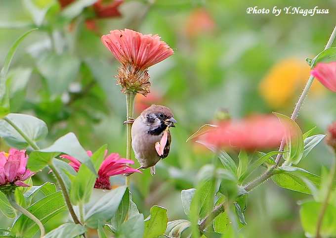 2017年10月22日 スズメ@ 花留まり 本日は、台風接近の雨。 10月5日撮影のスズメです。 この日、百日草にスズメが来ました。 花を散らしながら蜜を吸っていました。 スズメが蜜を吸っています。