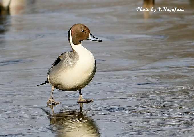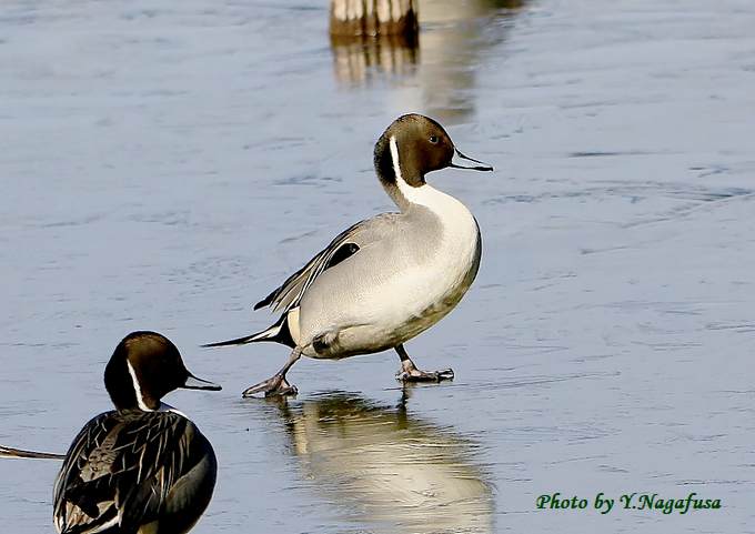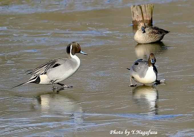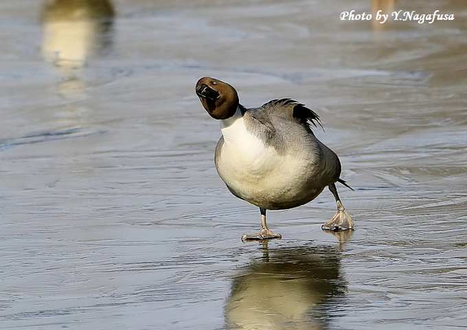 2018年1月10日 オナガガモA 氷上歩き 本日は、用事で鳥撮りは休み。 1月4日撮影のオナガガモの続きです。 氷の張った池は鴨類の休憩場所でした。 すべりながらヨタヨタ歩いています。 オナガガモが滑っています。