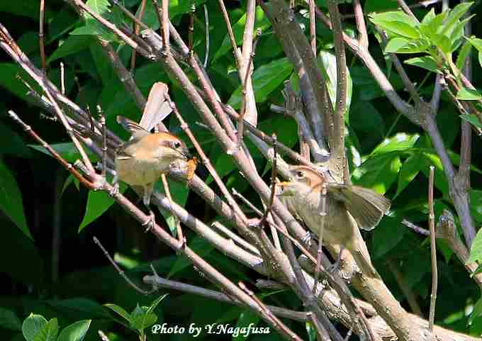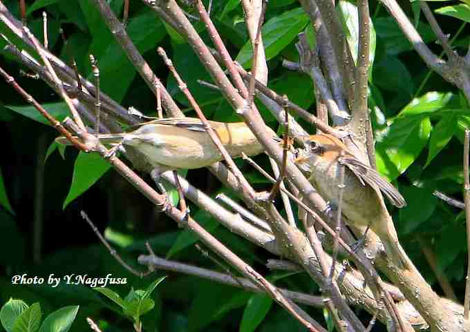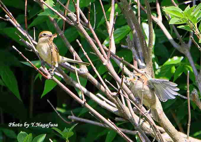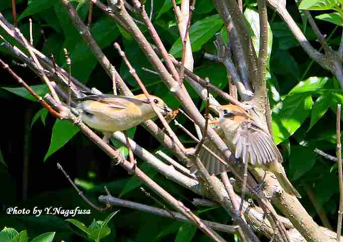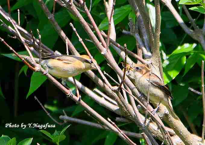 2018年5月3日 モズ親子 給餌 本日は、雨のち晴れ。 4月30日撮影のモズ親子です。 この日も給餌場面がありました。 前回は♂親でしたが今回は♀親の給餌が撮れました(小枝被りですが)。 モズ♀親が餌を咥えてきました。右側は巣立ち雛。