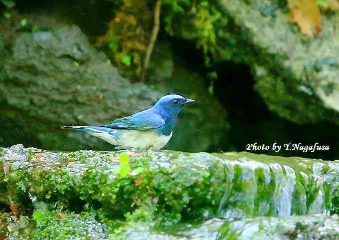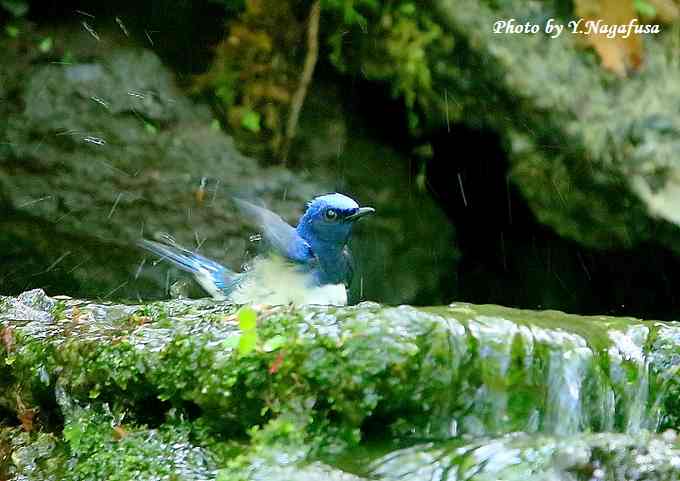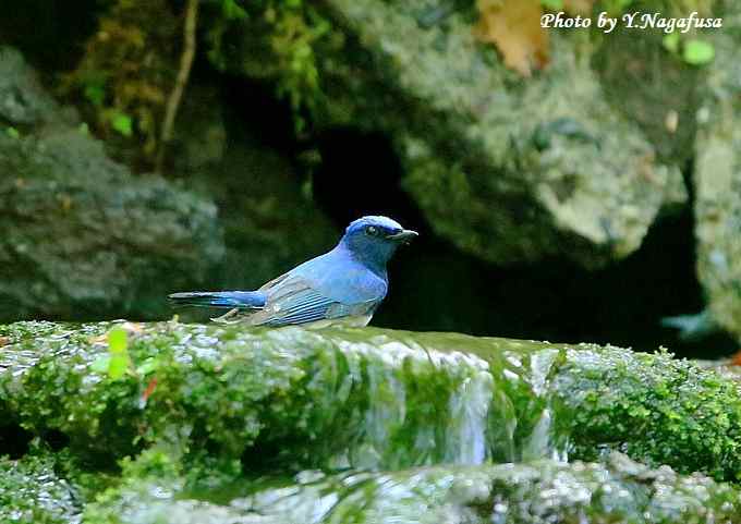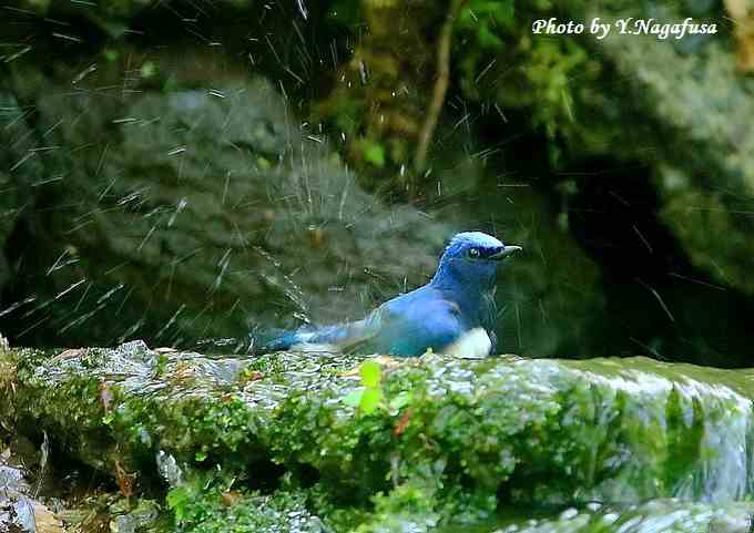 2018年5月19日 オオルリ♂ 水浴び 本日は、6羽の雛を連れたカルガモ親子を見ました。 5月16日撮影のオオルリ♂です。 この日、現地到着からあまり待たないでオオルリが出てきてくれました。 オオルリ♂が来ました。