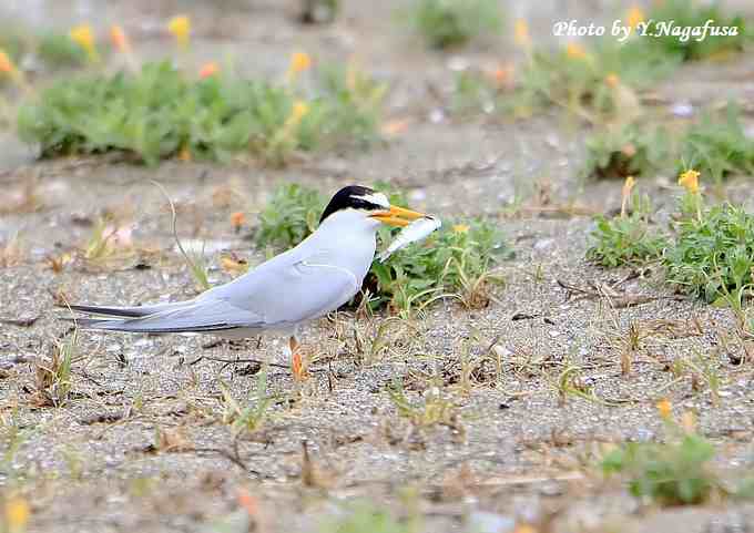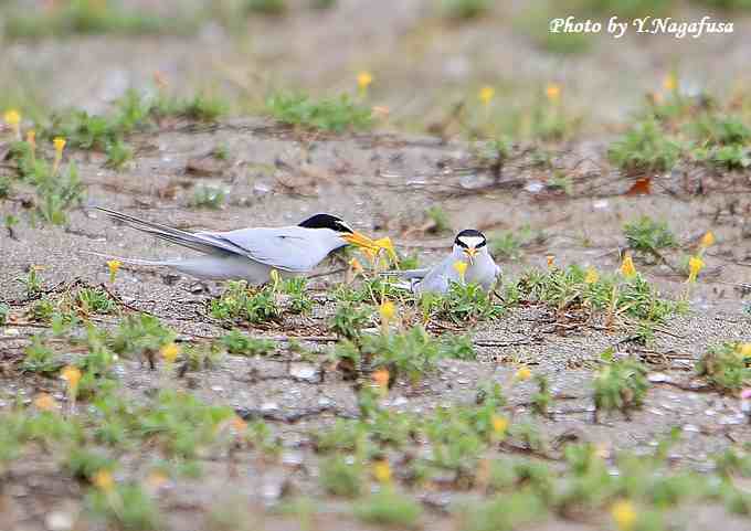 この日、コアジサシの抱卵中の場所で給餌する場面がありました。