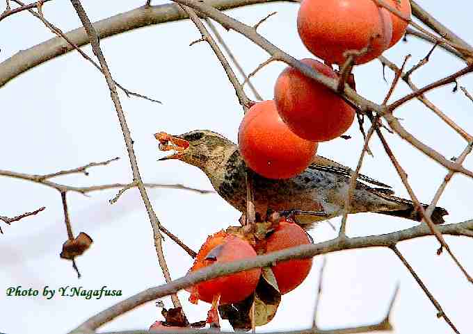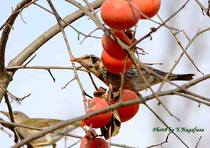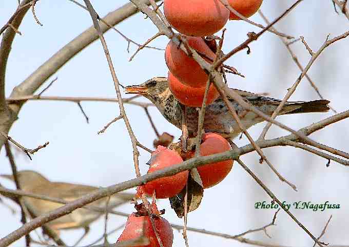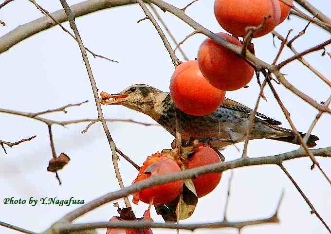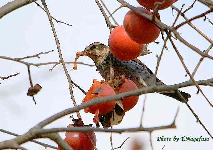 2018年12月18日 ツグミ 柿採餌 本日は、もう一度オジロビタキに会って来ました。 12月8日撮影のツグミです。 この日、柿の木には数種類の鳥が食事に来ていました。 ツグミが柿を食べに来ました。