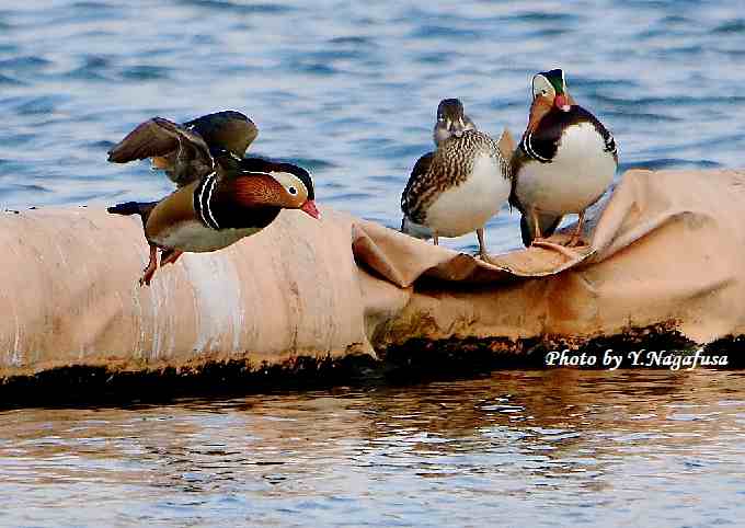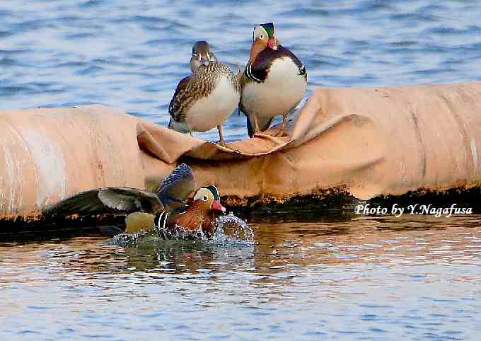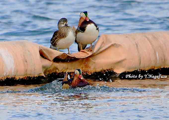 2019年2月9日 オシドリA 飛び降り 本日は、雪がチラホラで寒い。 2月5日撮影のオシドリの続きです。 この日、オシドリはウキに乗ったり降りたりしてすごしています。 オシドリが飛び降ります。