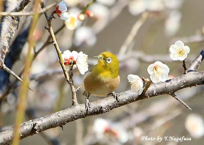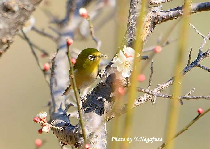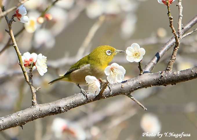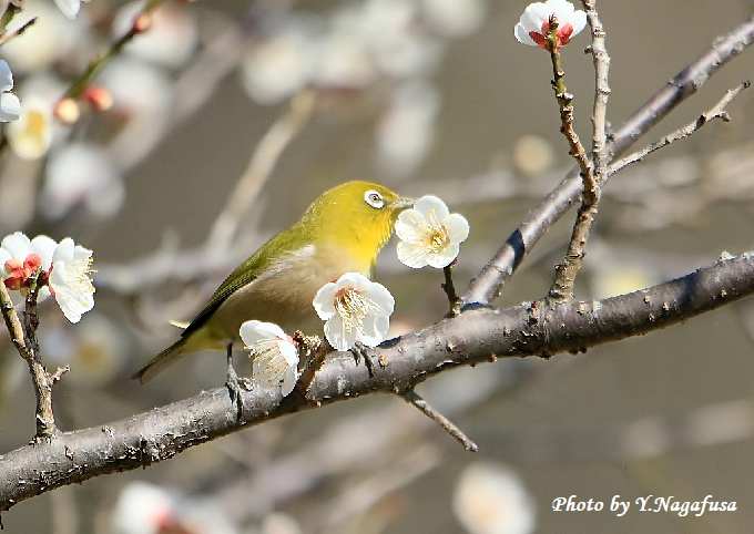 2019年2月27日 メジロ 白梅留まり 本日も曇り。 2月18日撮影のメジロです。 この日、満開の白梅にメジロが来ました。 梅園の端にある梅ノ木にようやくメジロが来てくれました。 メジロが蜜を吸っています。
