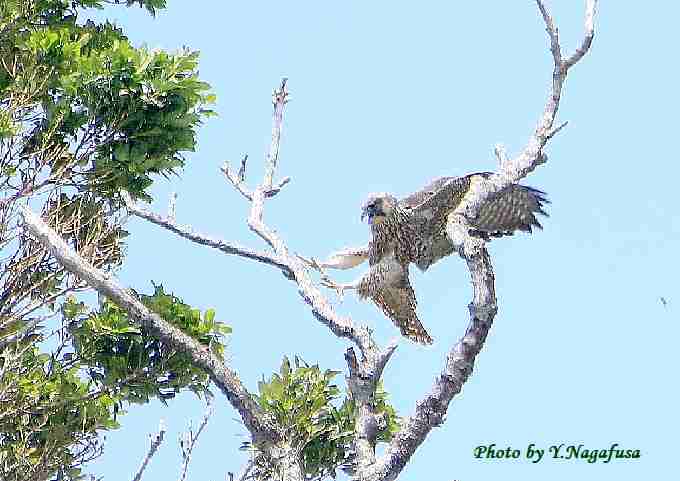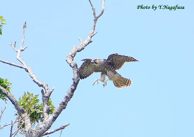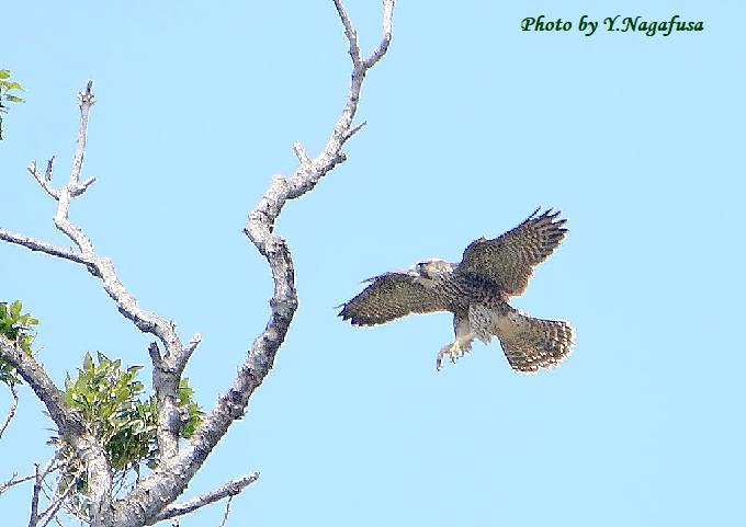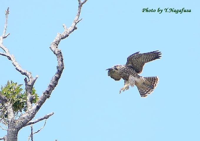 2019年6月3日 ハヤブサ7 雛 飛び付き 本日は、近くの川のカルガモ親子の確認のみ。 5月19日撮影のハヤブサの続きです。 この日、ハヤブサ雛は数回旋回すると木に飛び付いて休憩します。 飛べるようになったハヤブサ雛が飛び付きます。