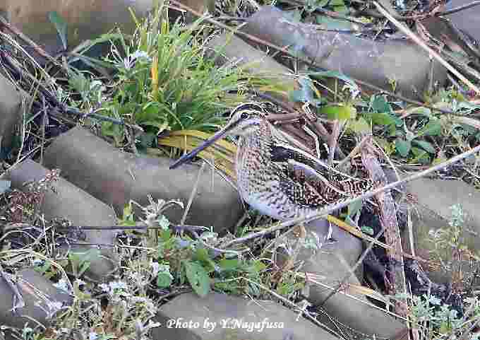 この日、ミコアイサ♀を撮っていたらタシギが近くに飛んで来ました。