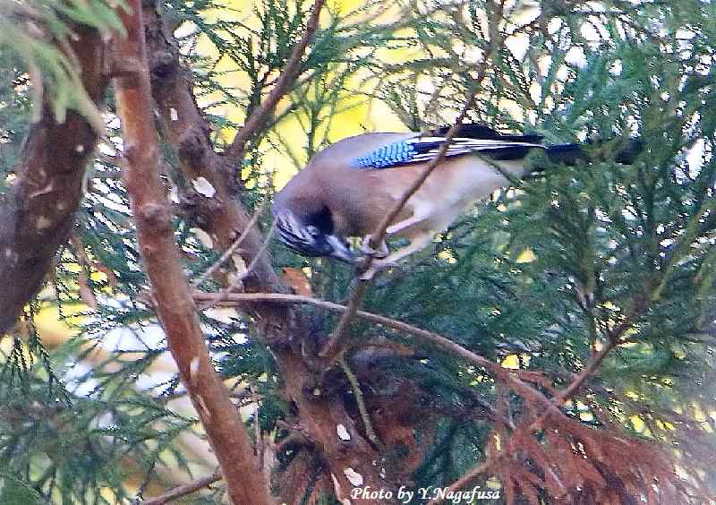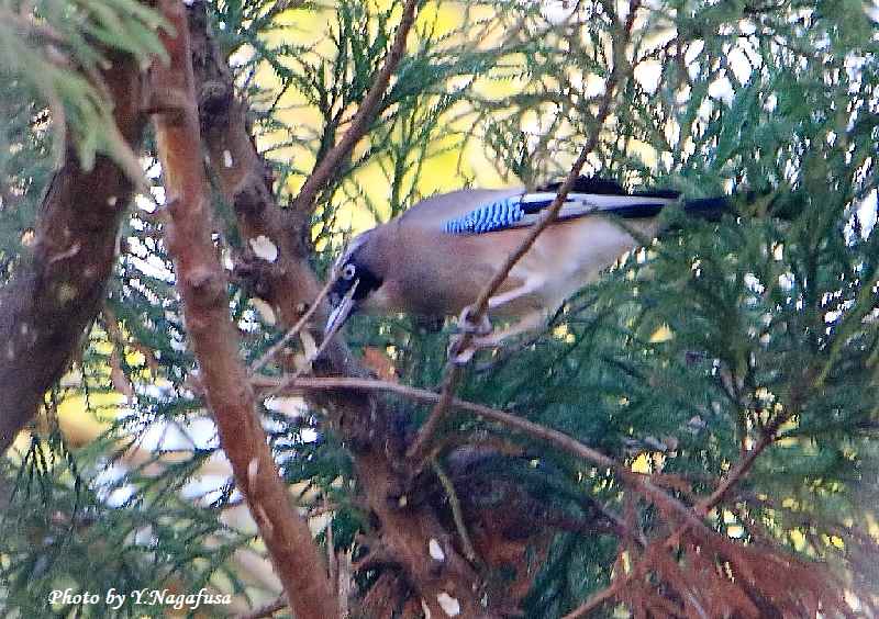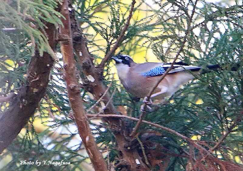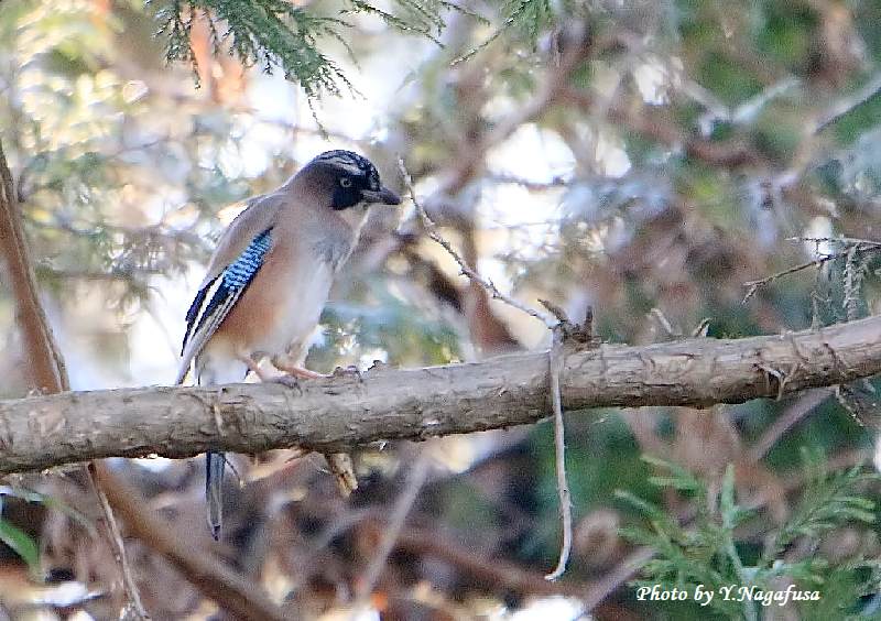 2020年1月22日 カケス 枝留まり 本日は、曇り時々霧雨のち晴れ又は曇り。 1月16日撮影のカケスです。 この日、公園内を散策していると遠くでカケスらしい鳥を見つけました。 隠れてしまったのでしばらく待っていると少しだけ出てきてくれました。 カケスが見えました。