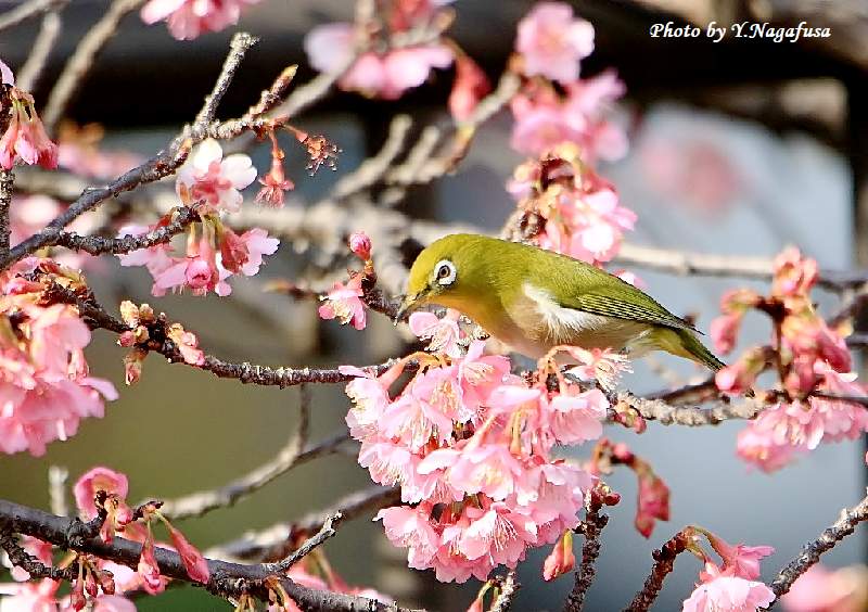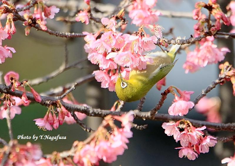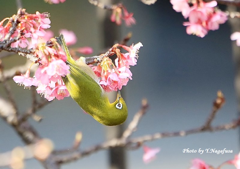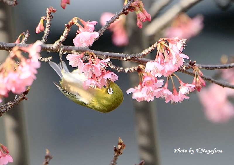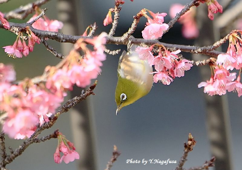 2022年1月9日 メジロB 河津桜 枝留まり 本日は、クイナに会えました。 12月25日撮影のメジロの続きです。 この日、河津桜に数羽のメジロが蜜を吸っていました。 下向きの桜の花に対し下から嘴を入れます。 メジロが来ました。