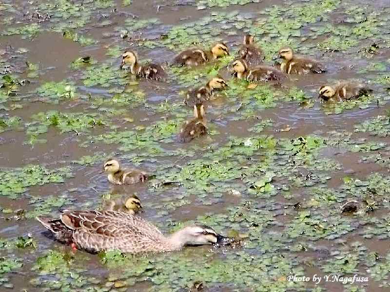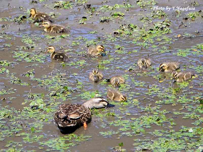 2022年5月28日 カルガモ 親子 本日は、ハヤブサを見てきました。雛は巣立ちしていました。 5月24日撮影のカルガモ親子です。 この日、遊水地に10羽の雛を連れたカルガモ親子が居ました。 カルガモ親子です。