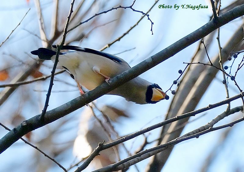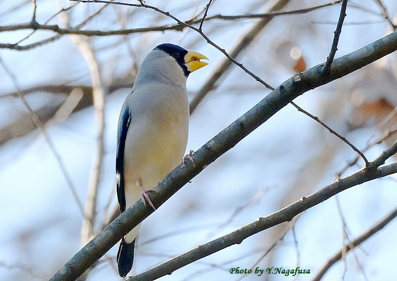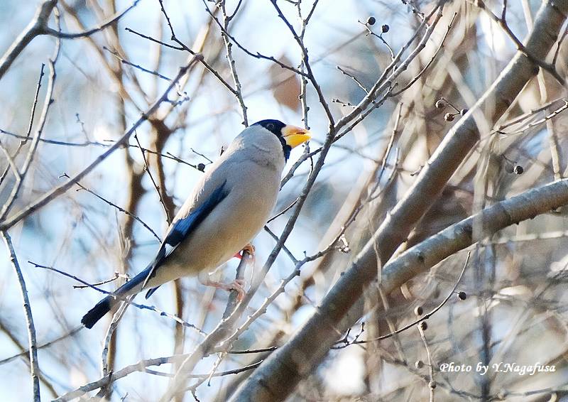 2023年2月25日 イカル 枝留まり、採餌 本日は、イカルが待っててくれました。 30分ほどで腹いっぱいになり引き上げました。 2月5日撮影のイカルです。 この日、公園から引き上げようとした時、イカルを見つけました。 木の実を盛んについばんでいました。 イカルが居ました。