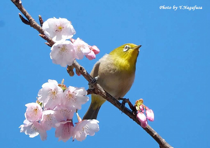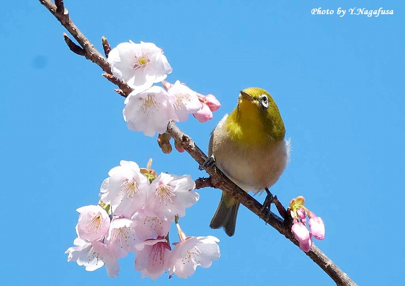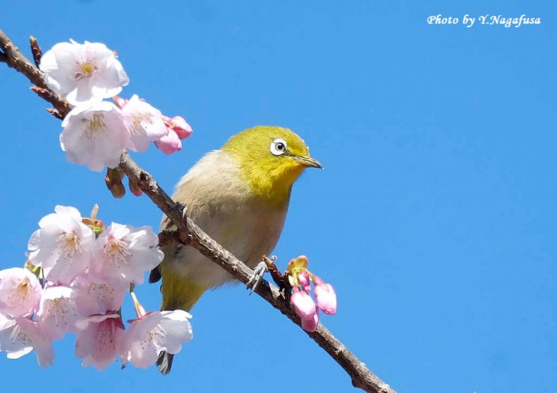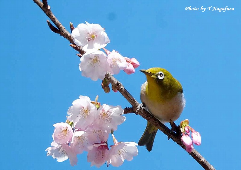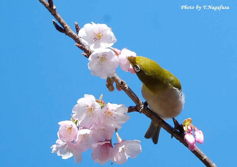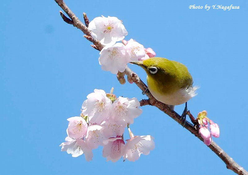 この日、早咲きの桜にメジロが蜜吸いに来ていました。