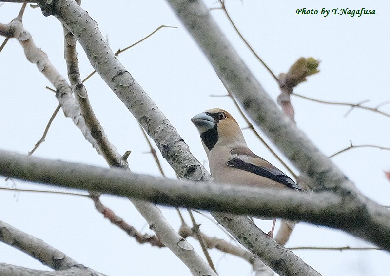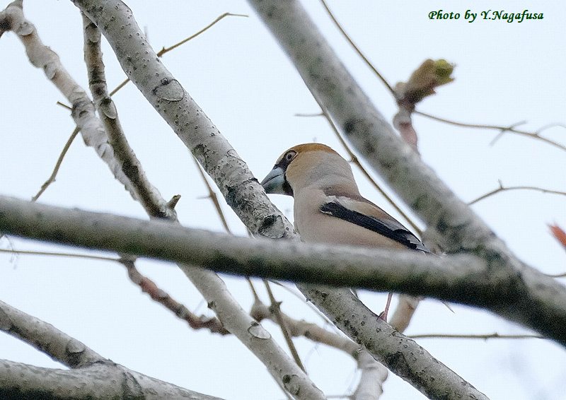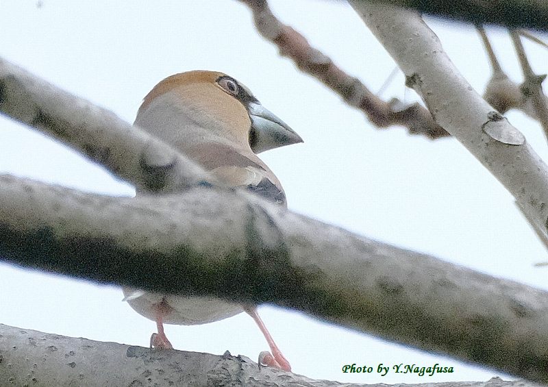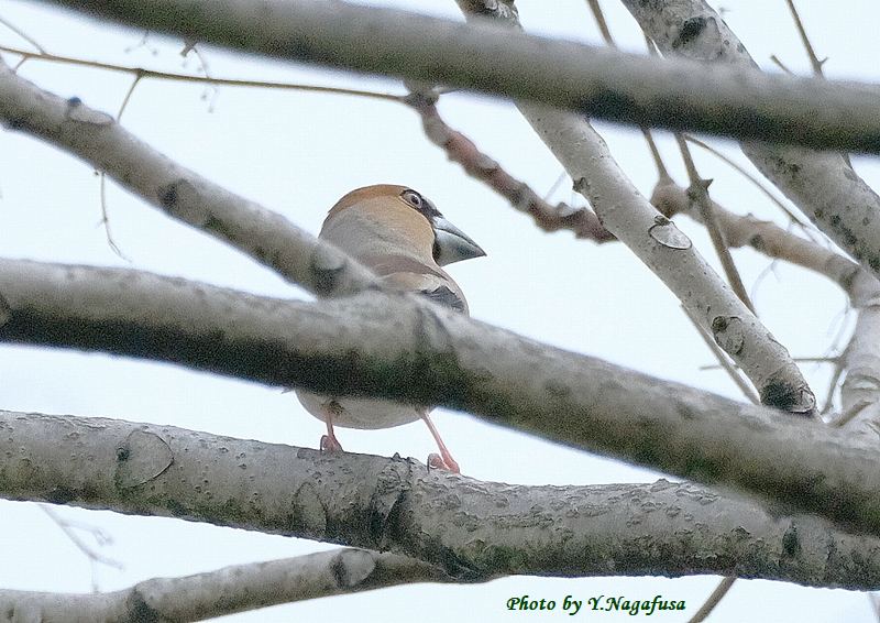 この日、公園の木の上の方にいるシメを見つけました。