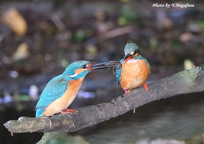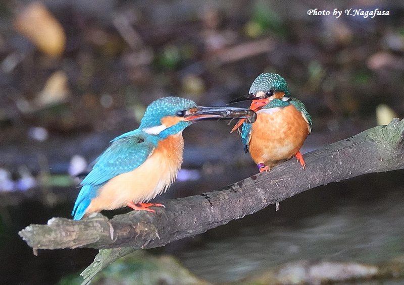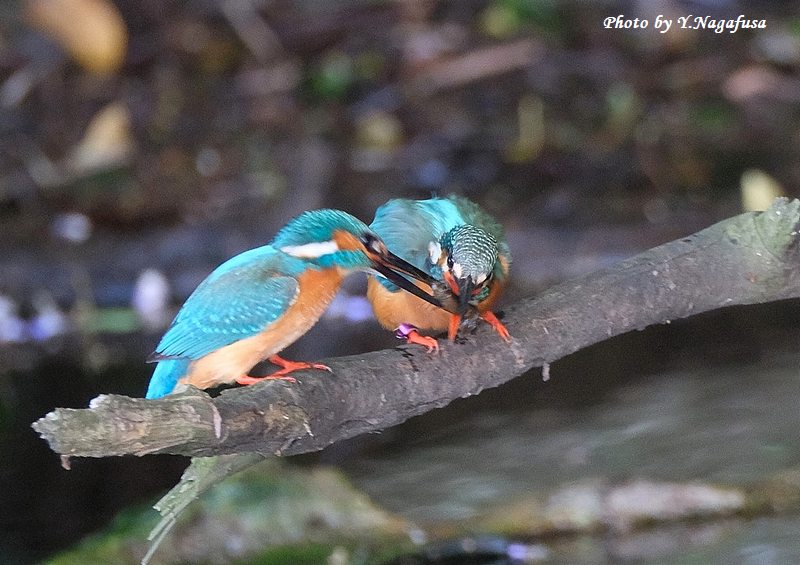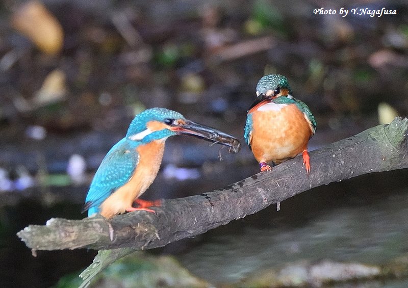 カワセミ♂左がザリガニを持ってきました。