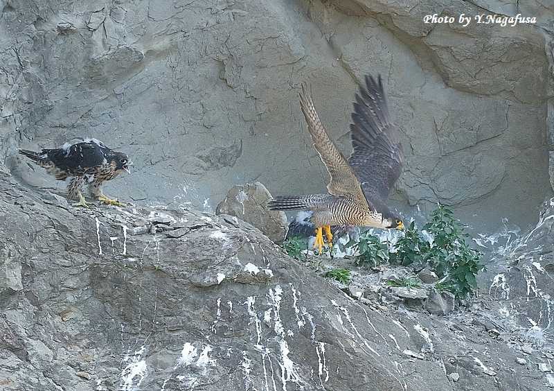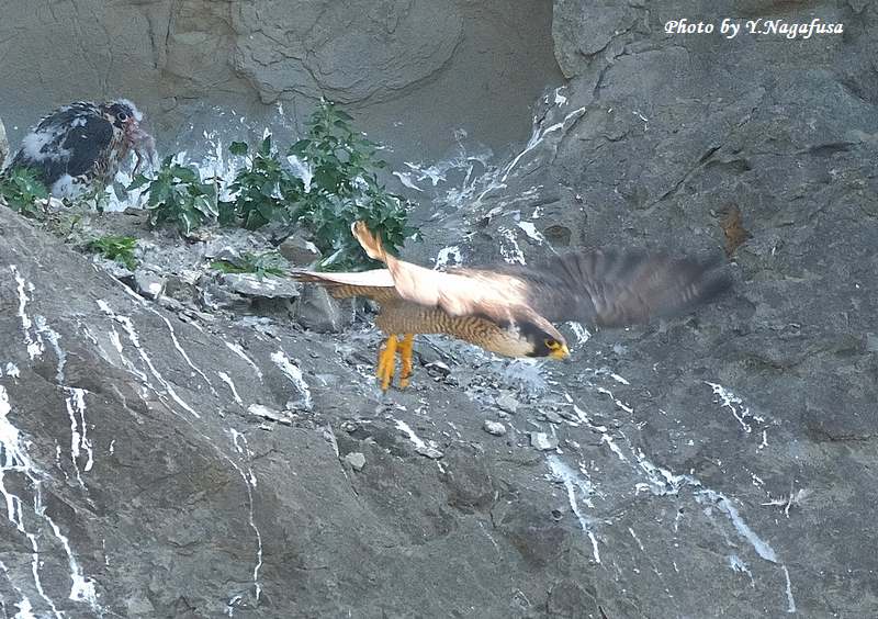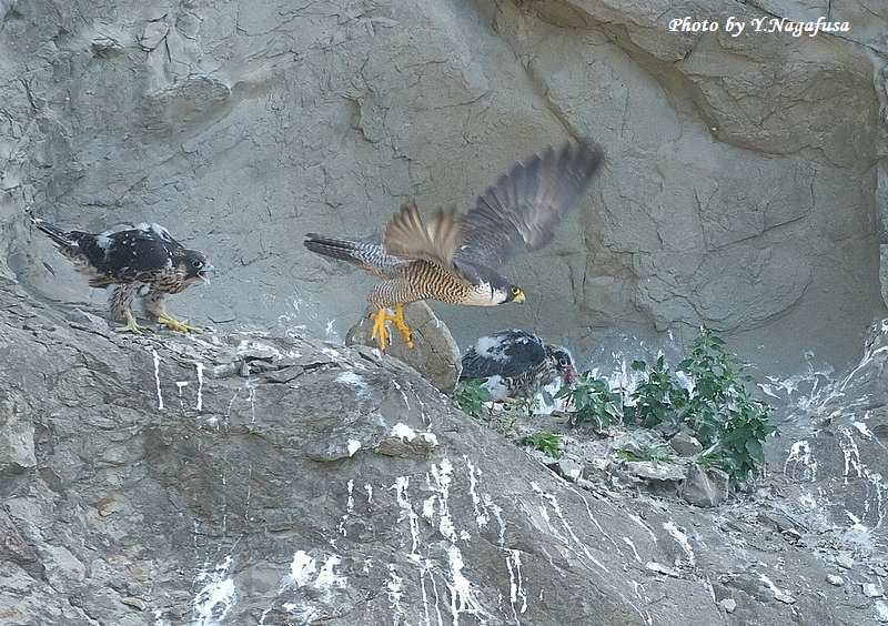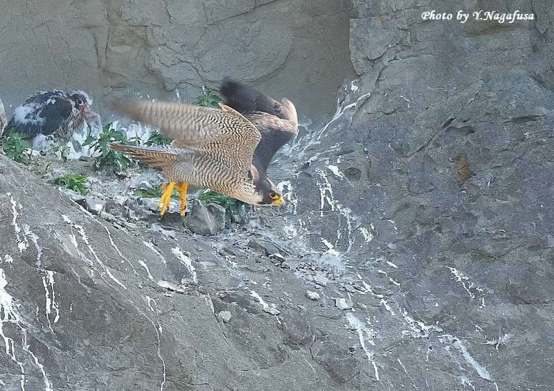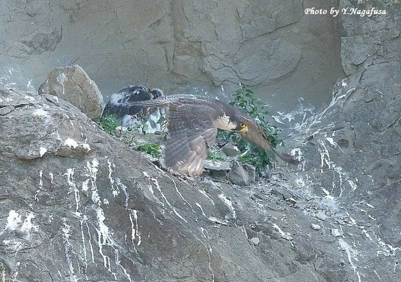 この日、ハヤブサ親は獲物を渡すと飛び出して行きました。