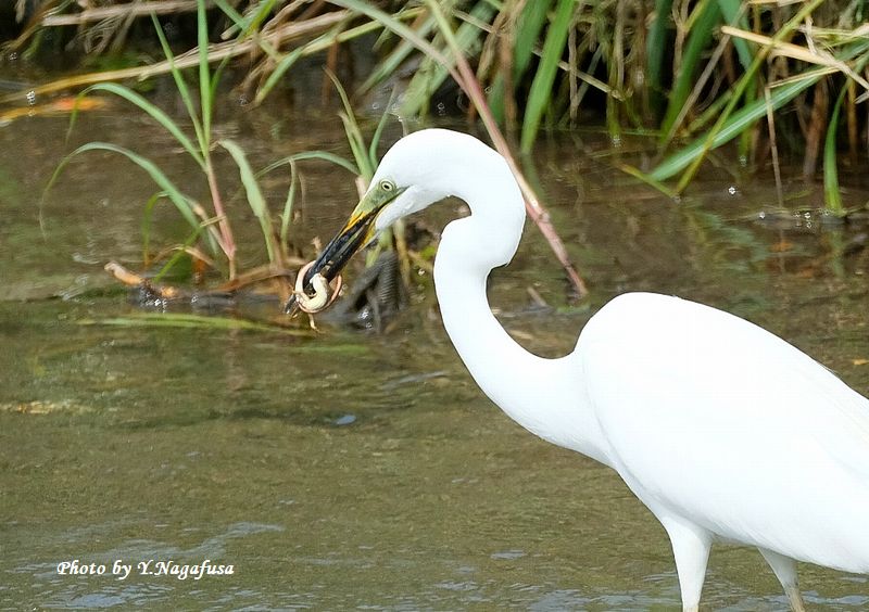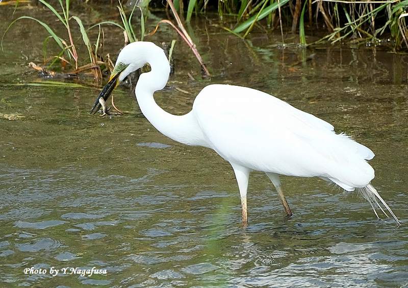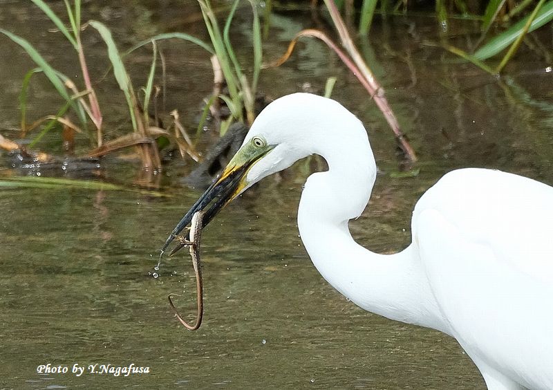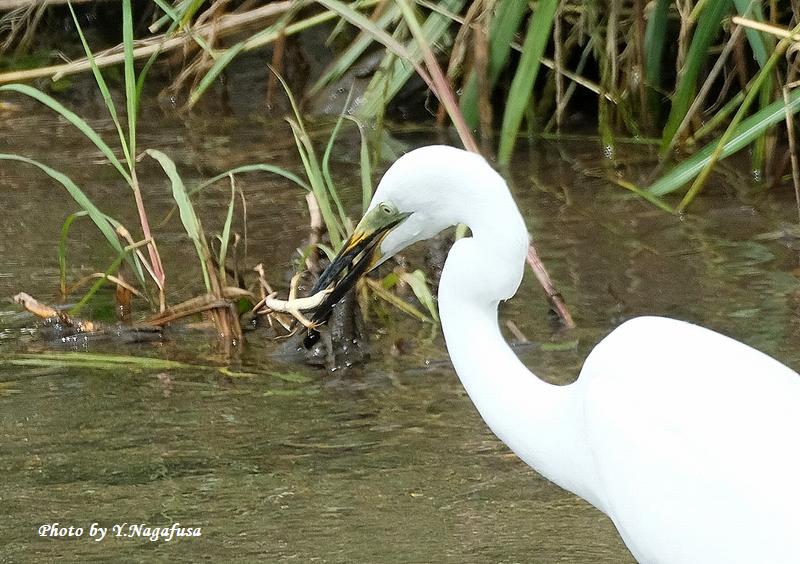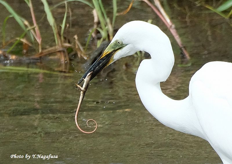 この日、婚姻色のダイサギがカナヘビを捕りました。