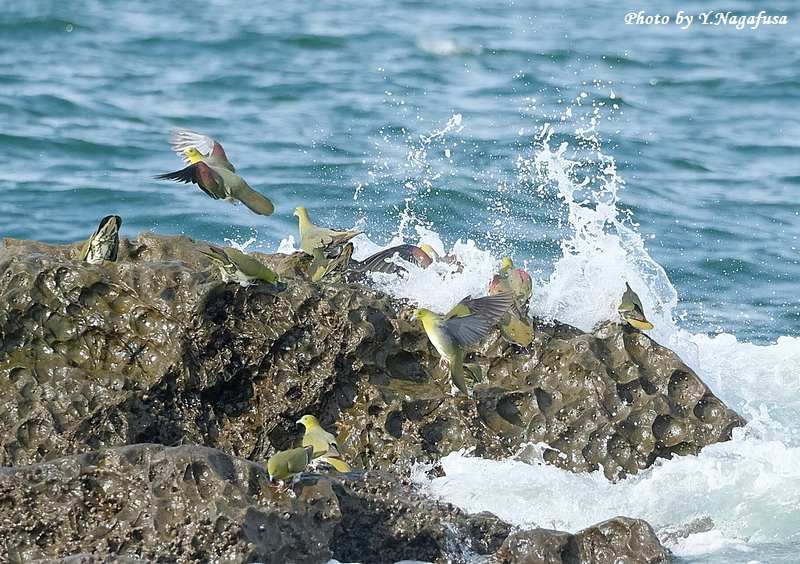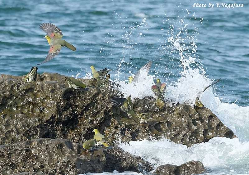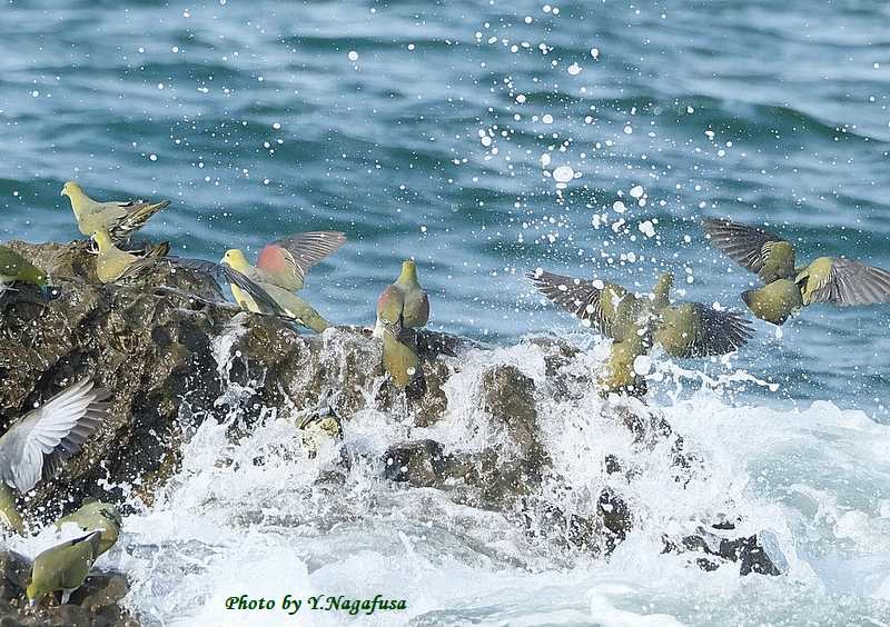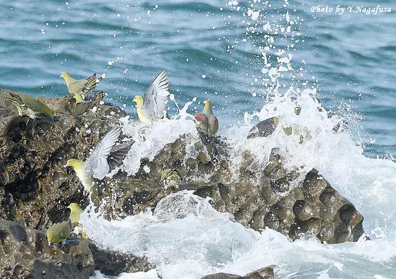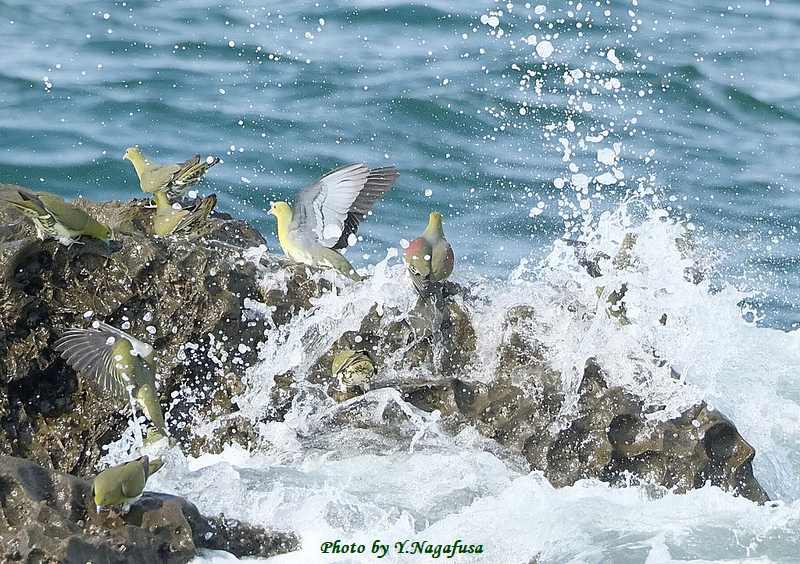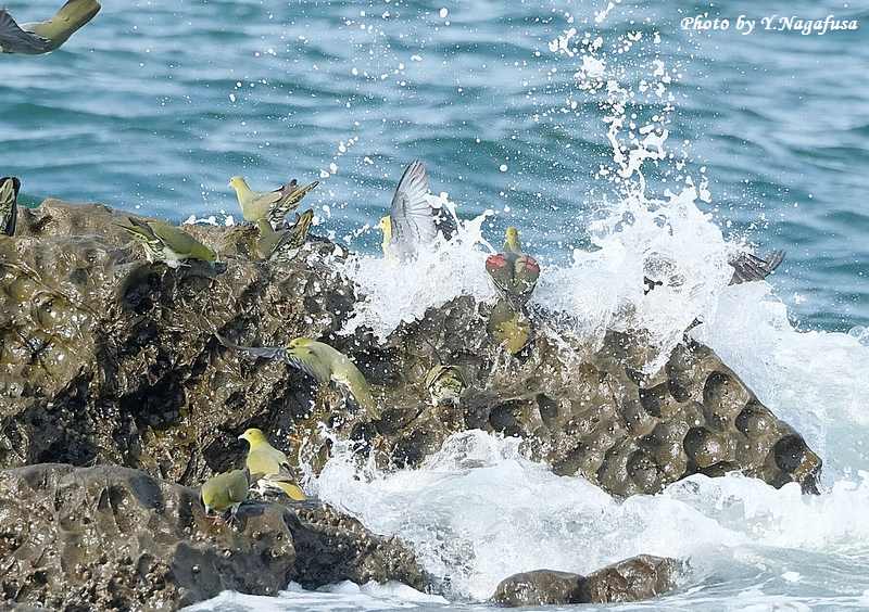 この日、アオバトは何回も波を被ります。