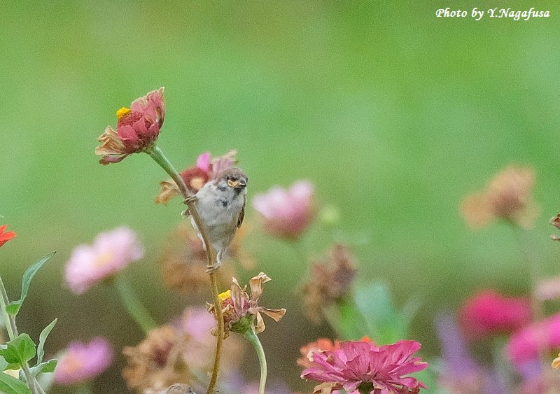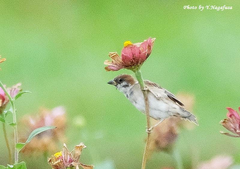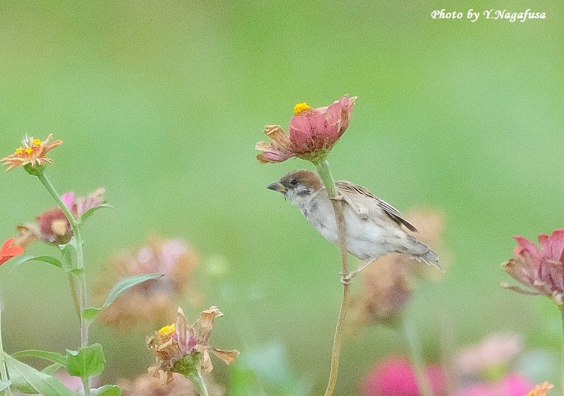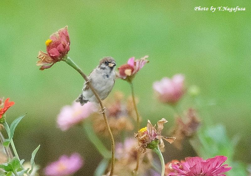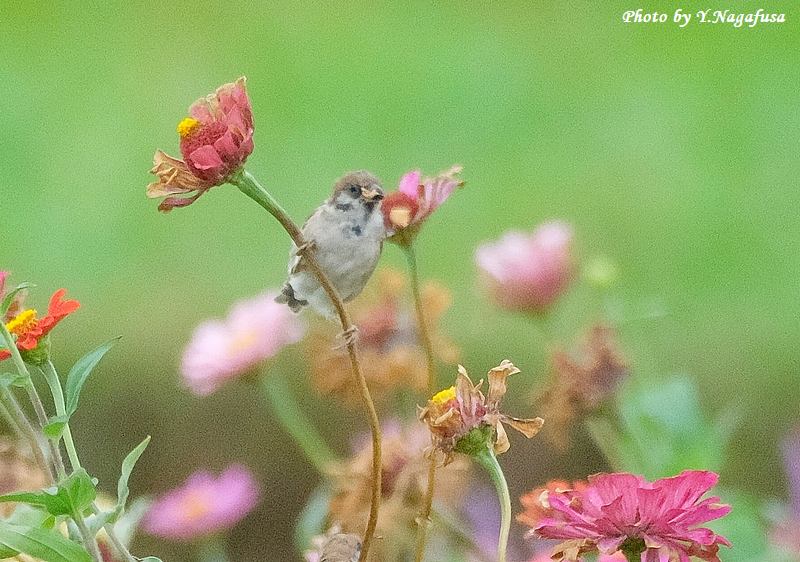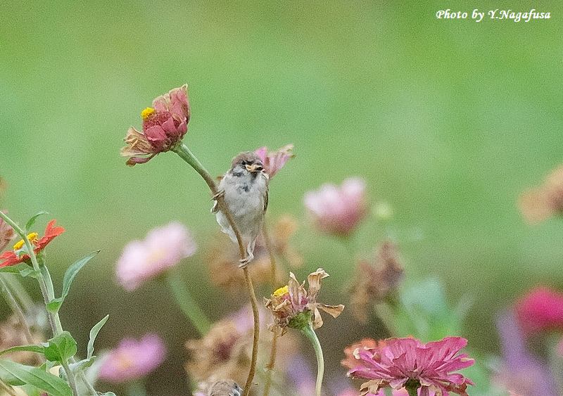 この日は、コスモスだけでなく百日草にもスズメが留まりました。