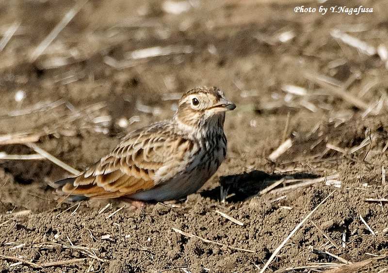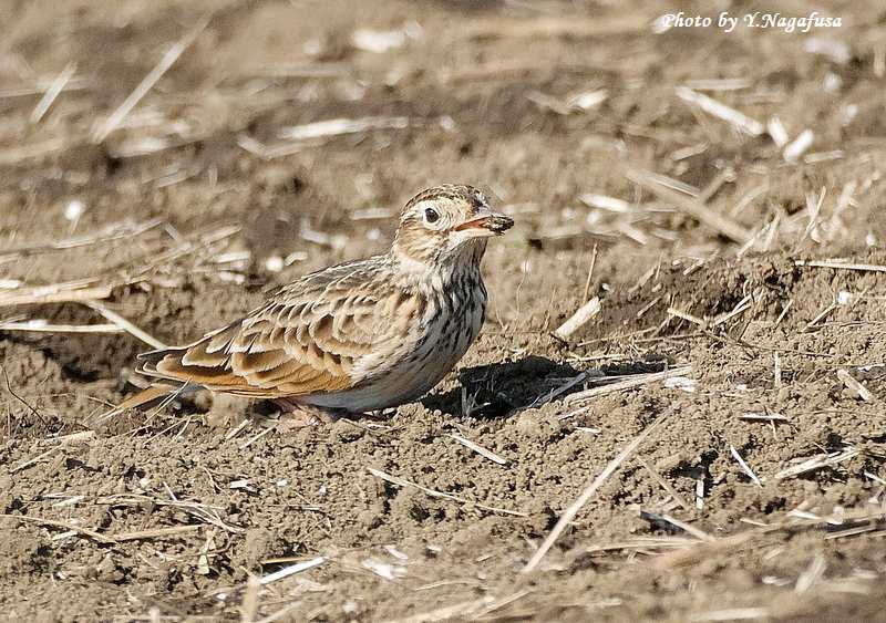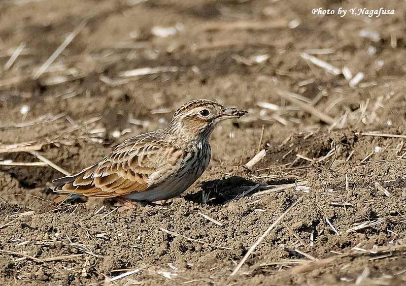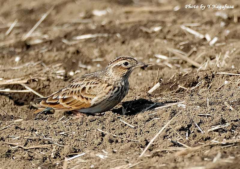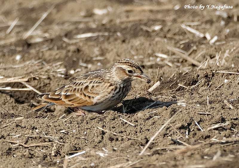 この日、順光側に回り込んだらヒバリが何かを食べていました。
