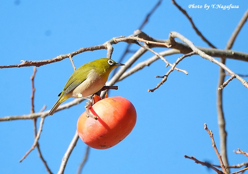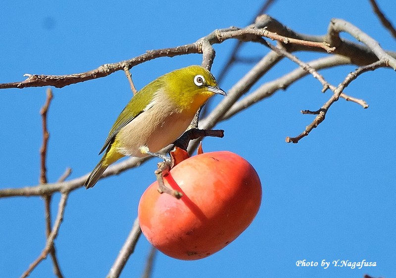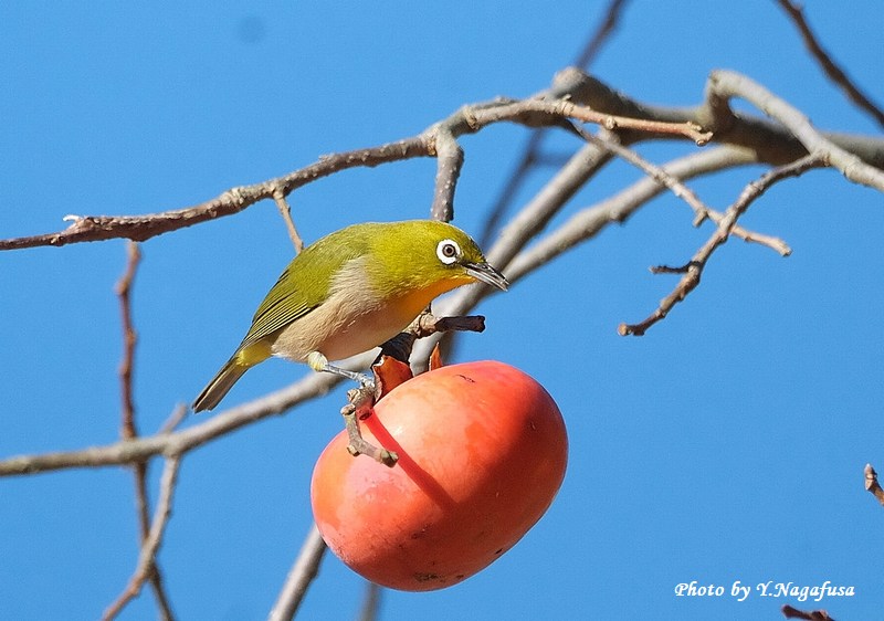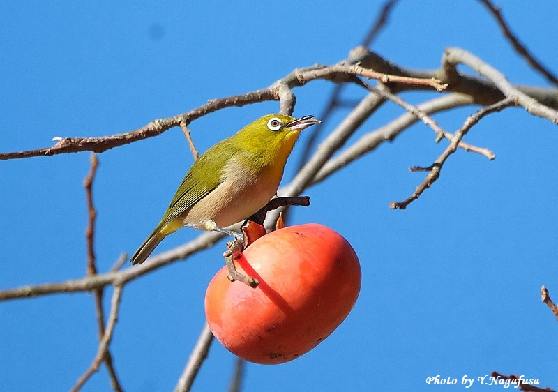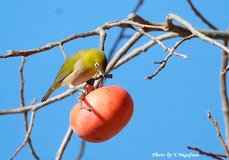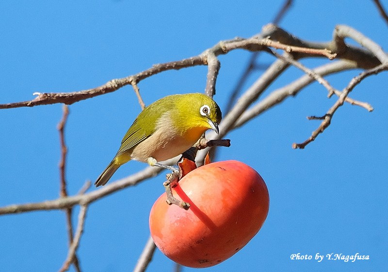 この日、公園の柿の木にメジロの群れが採餌していました。