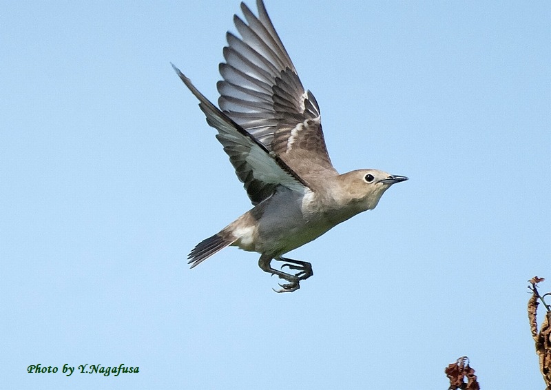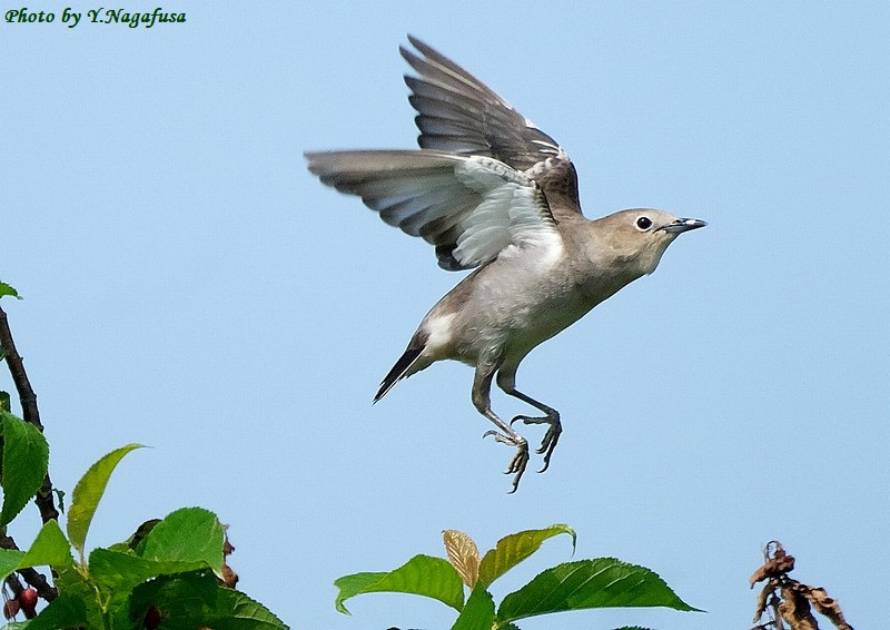 2025年5月18日 コムクドリ② ♀枝留まり、飛び出し 本日は、風が強い。 5月5日撮影のコムクドリの続きです。 この日、毎年サクランボのなる木にコムクドリが来ました。 コムクドリ♀です。mono 物