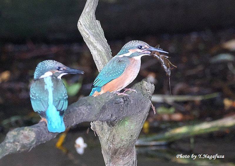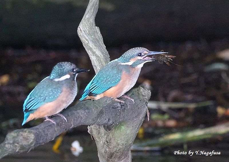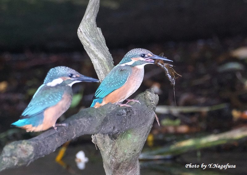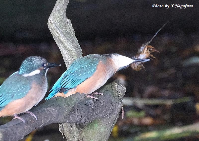 2025年6月15日 カワセミ5 雛、採餌 本日は、雨のち晴れ。 6月6日撮影のカワセミの続きです。 この日、カワセミ雛はザリガニを食べるのに苦労していました。 カワセミ雛です。mono 物
