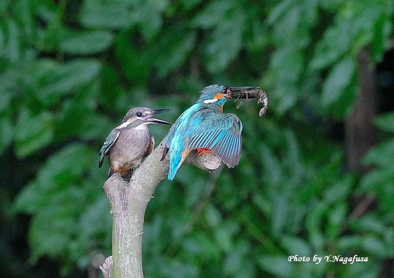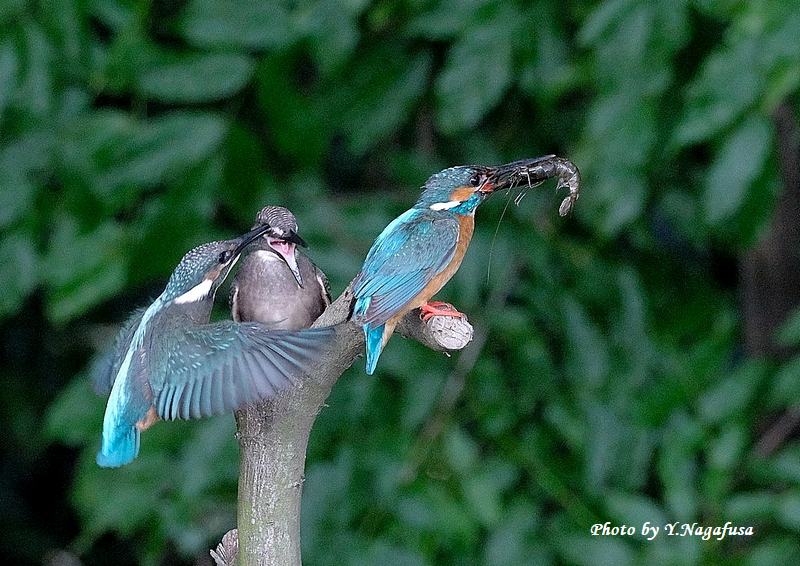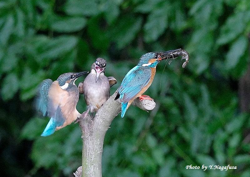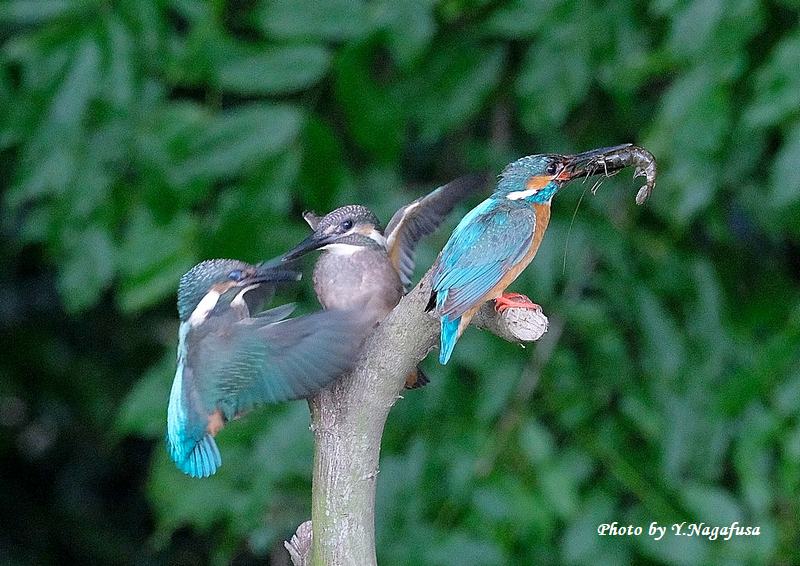 2025年6月21日 カワセミ8 親子、雛争い 本日は、私用で鳥撮りは休み。 6月6日撮影のカワセミの続きです。 この日、カワセミ雛同士の争いに勝たないと餌がもらえません。 カワセミ親右、雛左です。mono 物