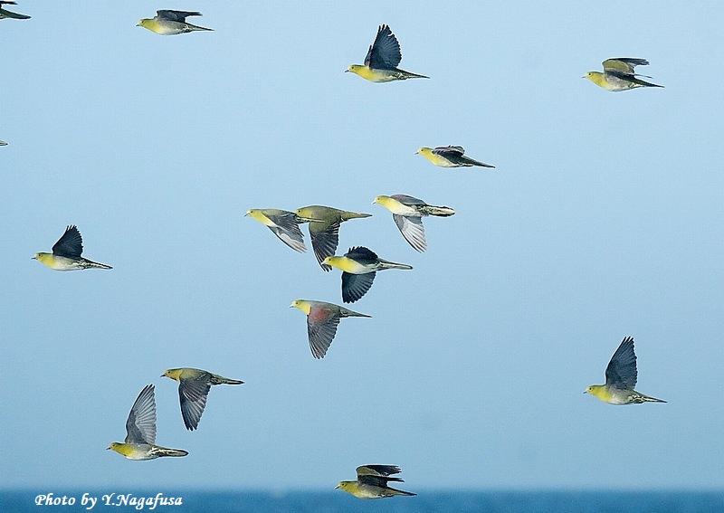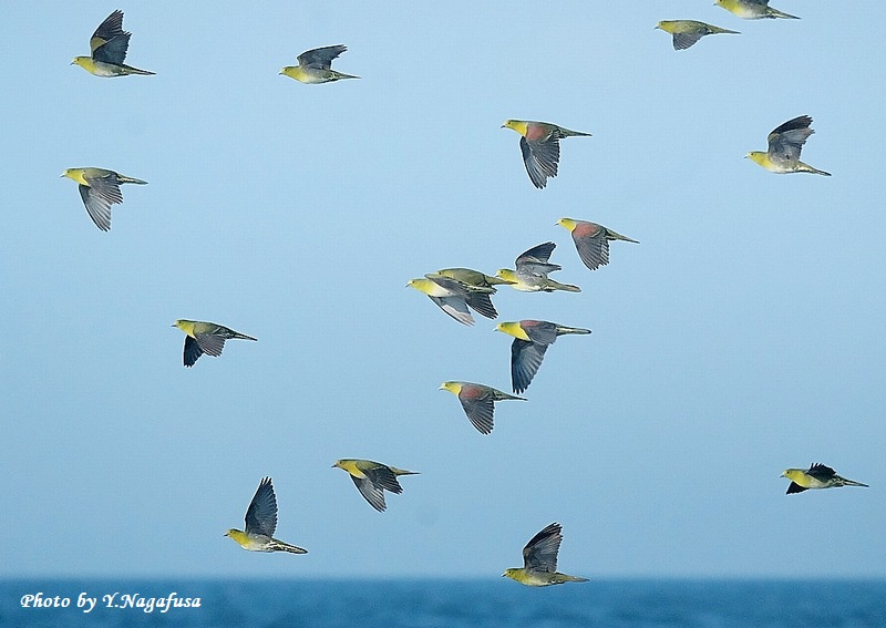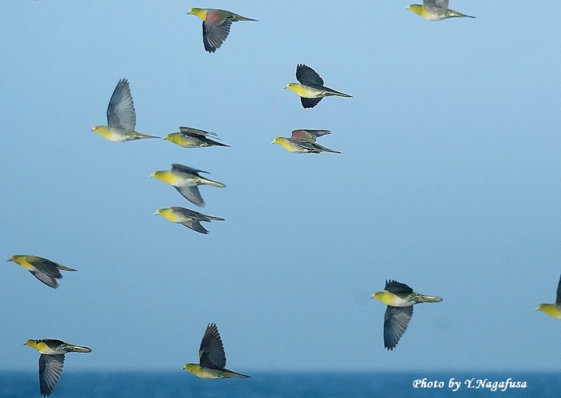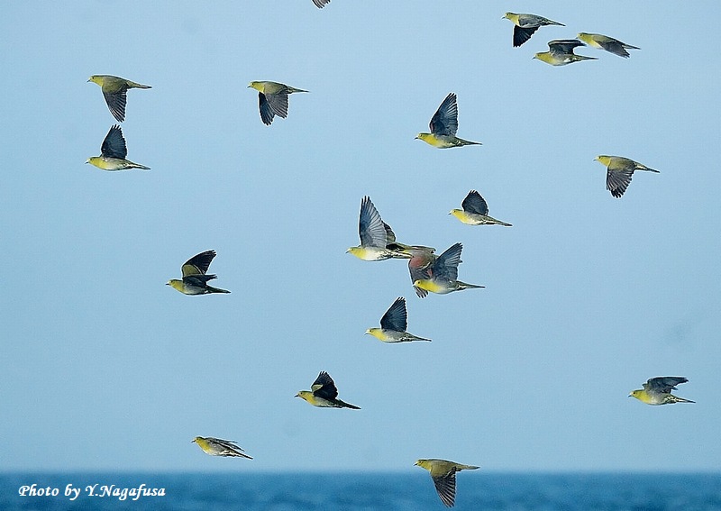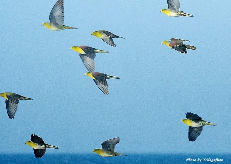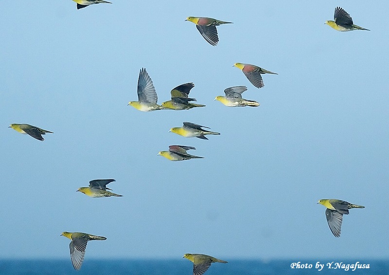 2025年7月12日 アオバト2 飛翔 本日は、ヒクイナ幼鳥を見てきました。 7月1日撮影のアオバトの続きです。 この日、毎年海水を飲みに来るアオバトの群れは何回も飛び回ります。 アオバトです。mono 物