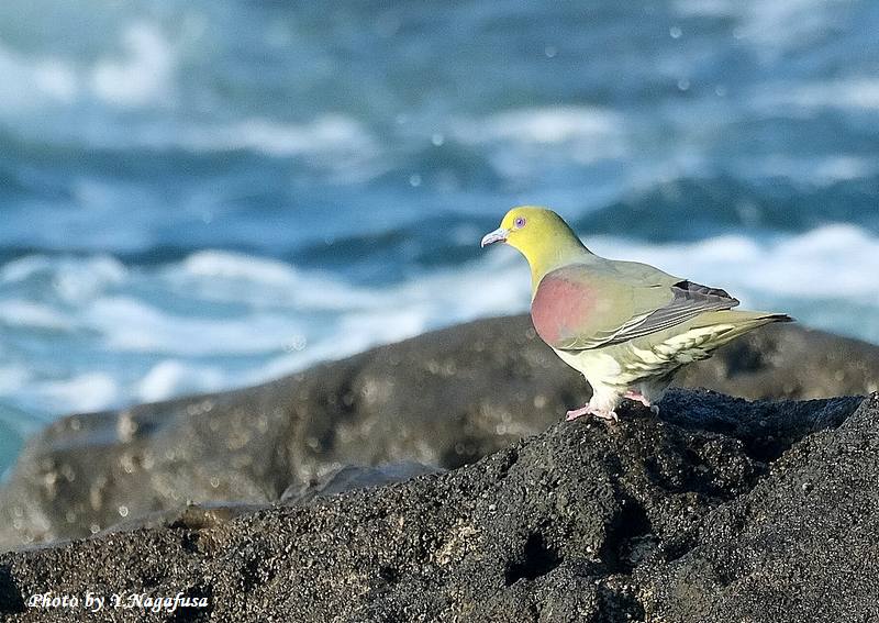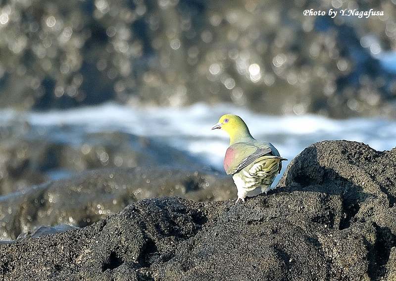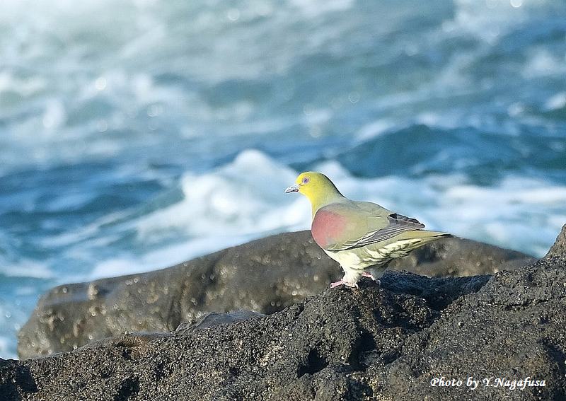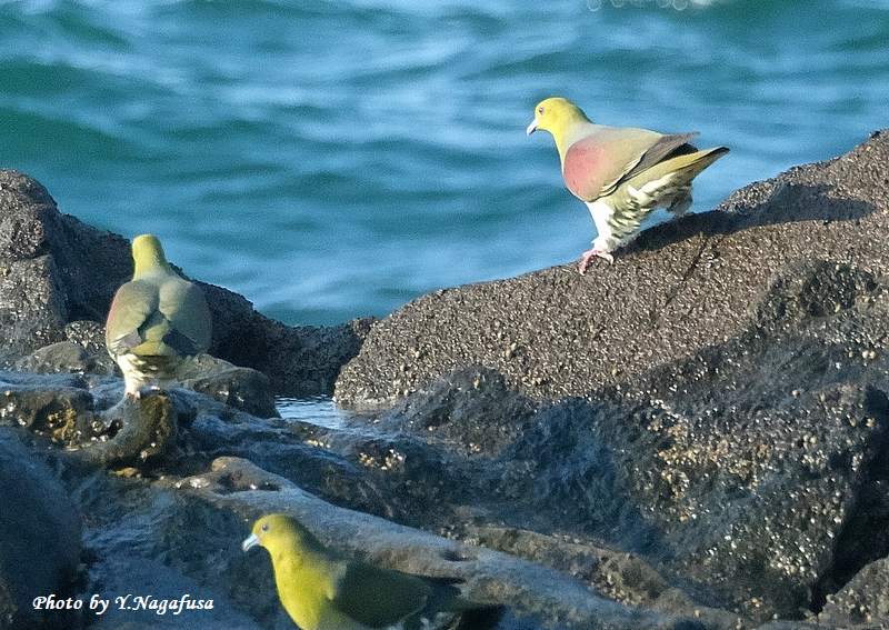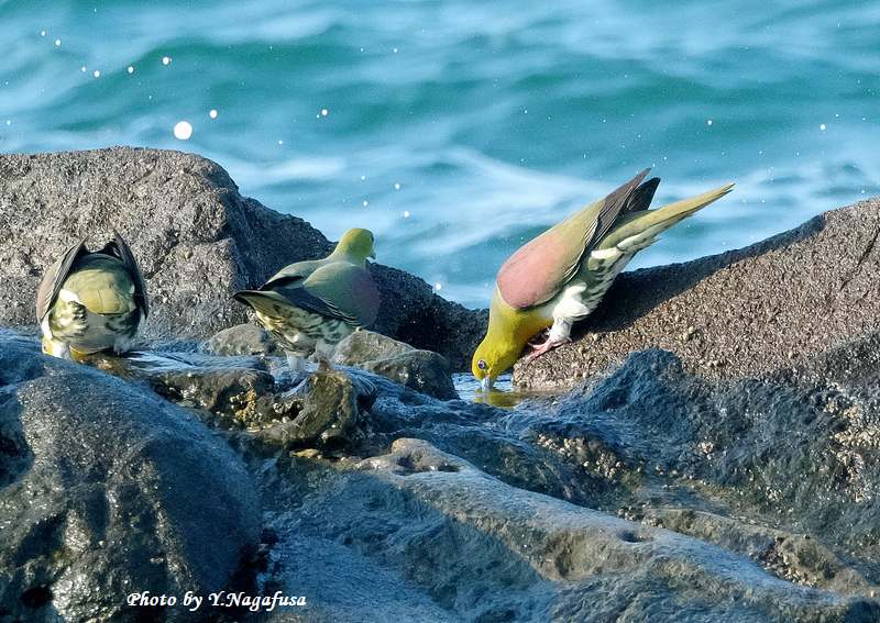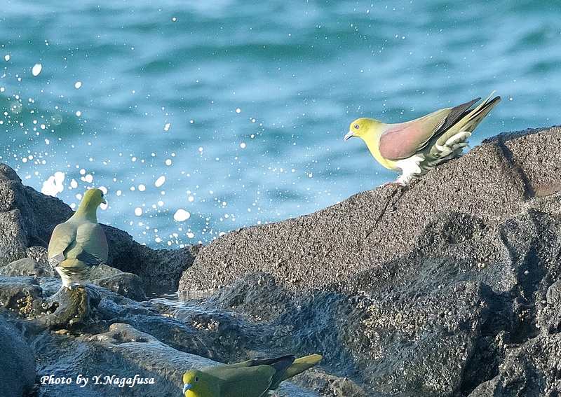 2025年7月13日 アオバト3 海水飲み 本日は、曇りのち晴れ。 7月1日撮影のアオバトの続きです。 この日、毎年海水を飲みに来るアオバトは岩礁に降りて海水を飲みます。 アオバトです。mono 物