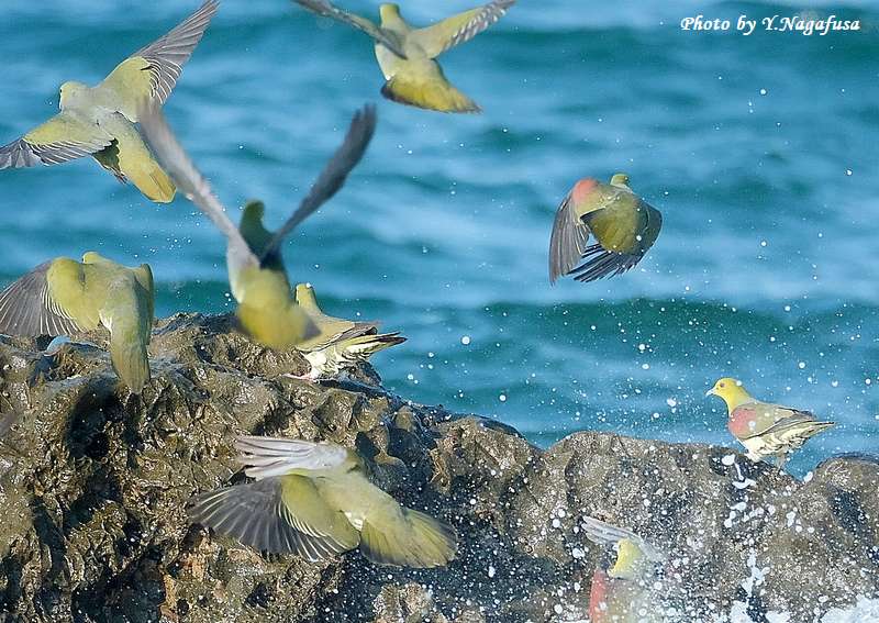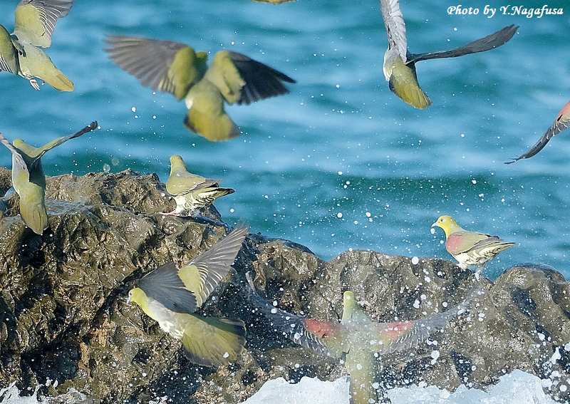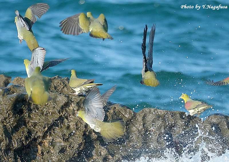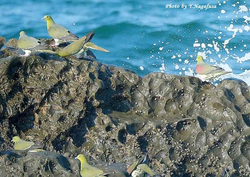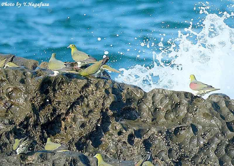 この日、アオバトは岩礁で逃げ遅れで波を被ります。