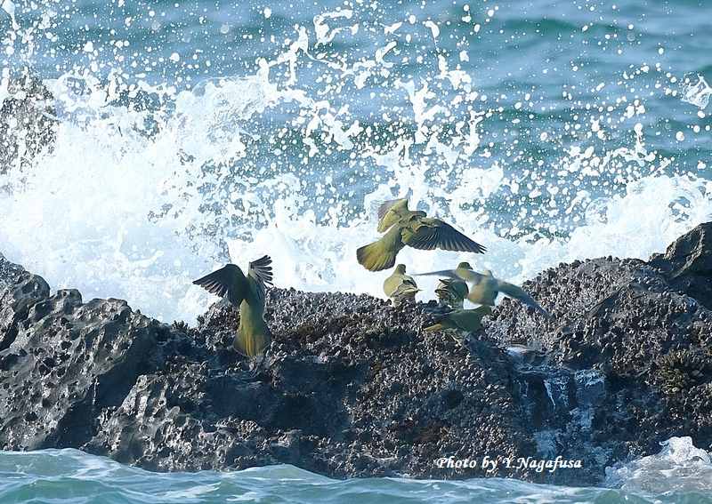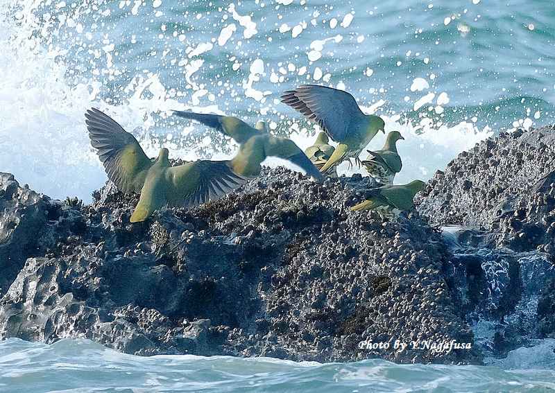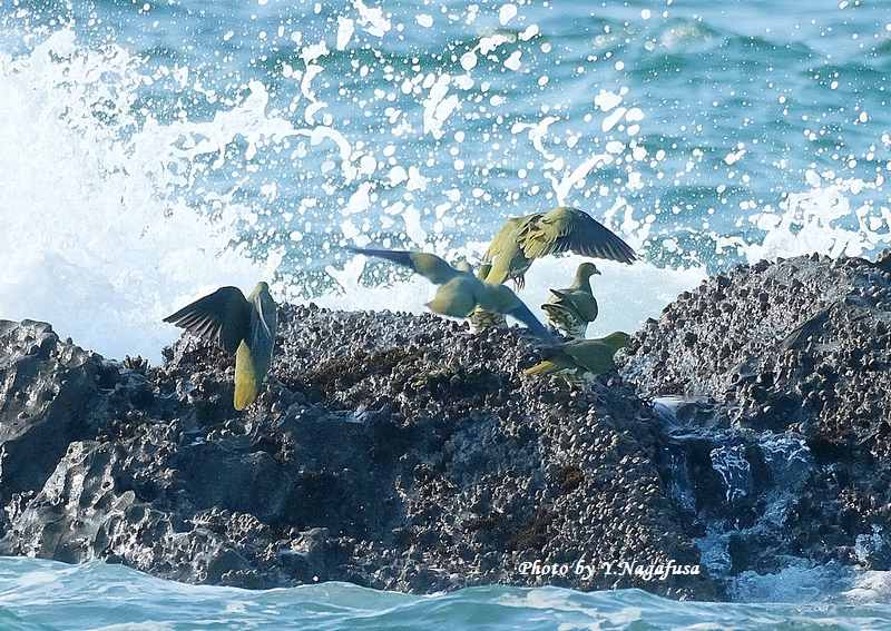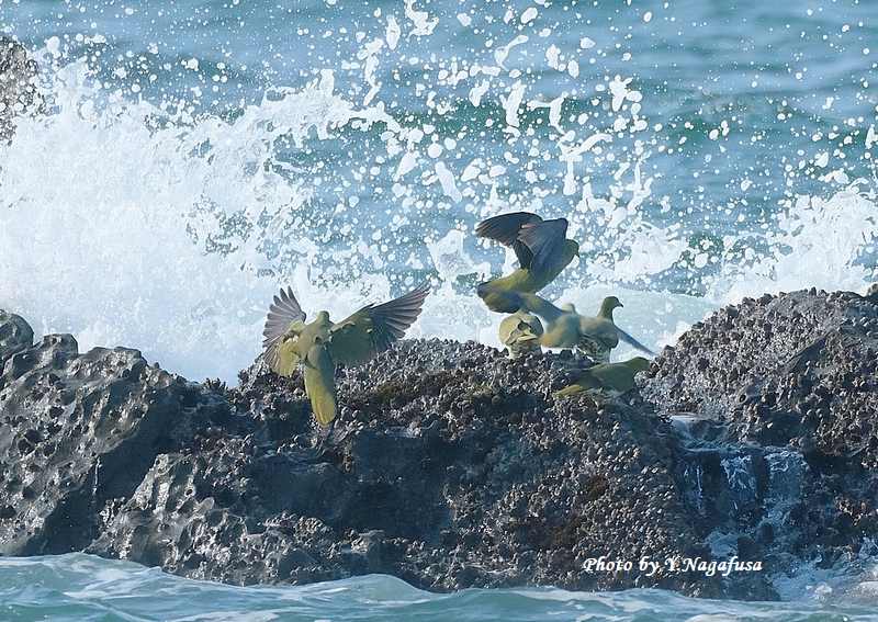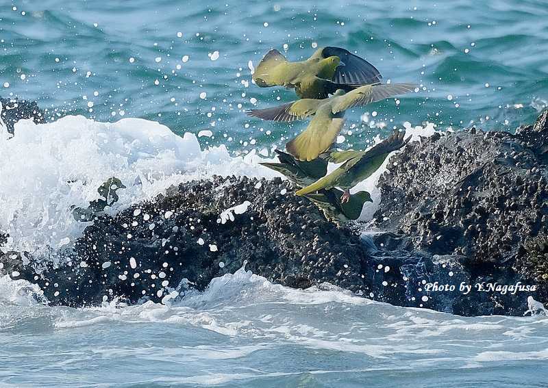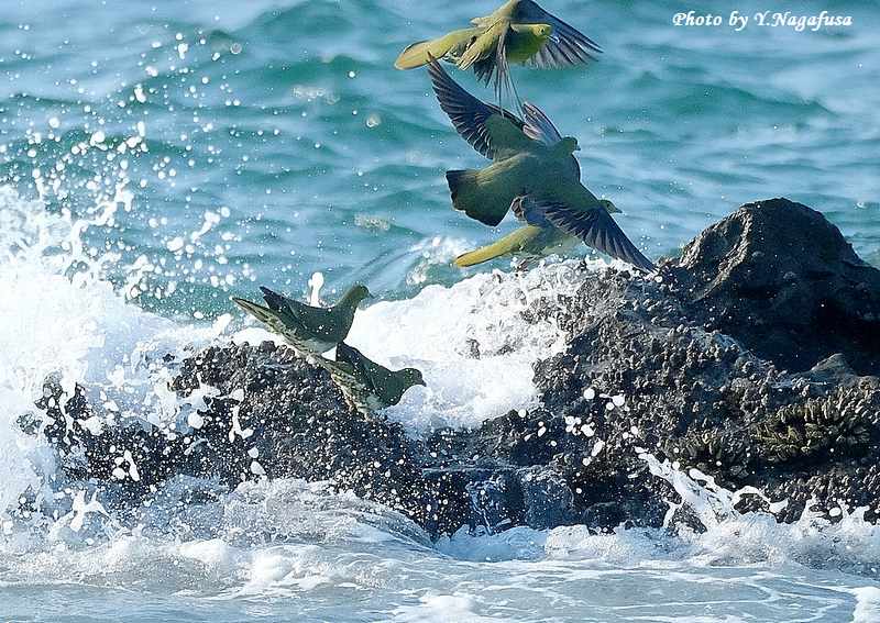 この日、アオバトは岩礁で逃げ遅れで波を被ります。