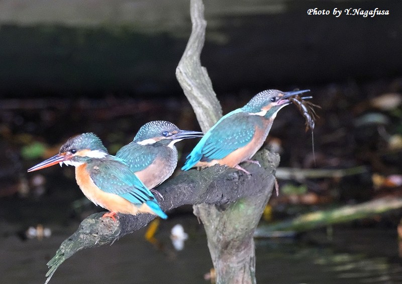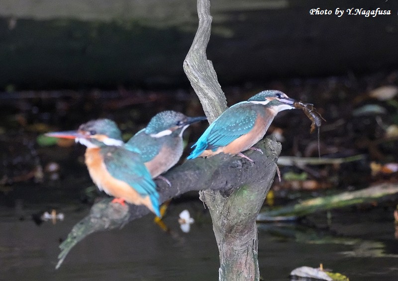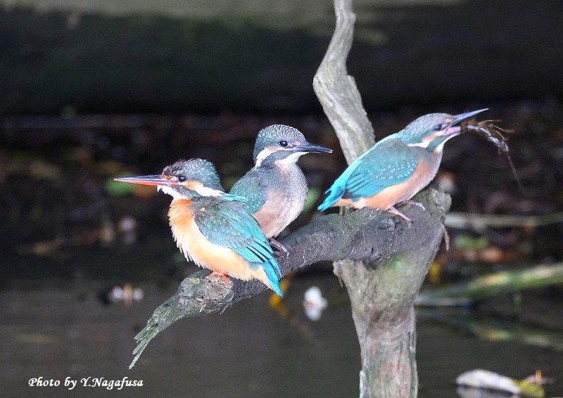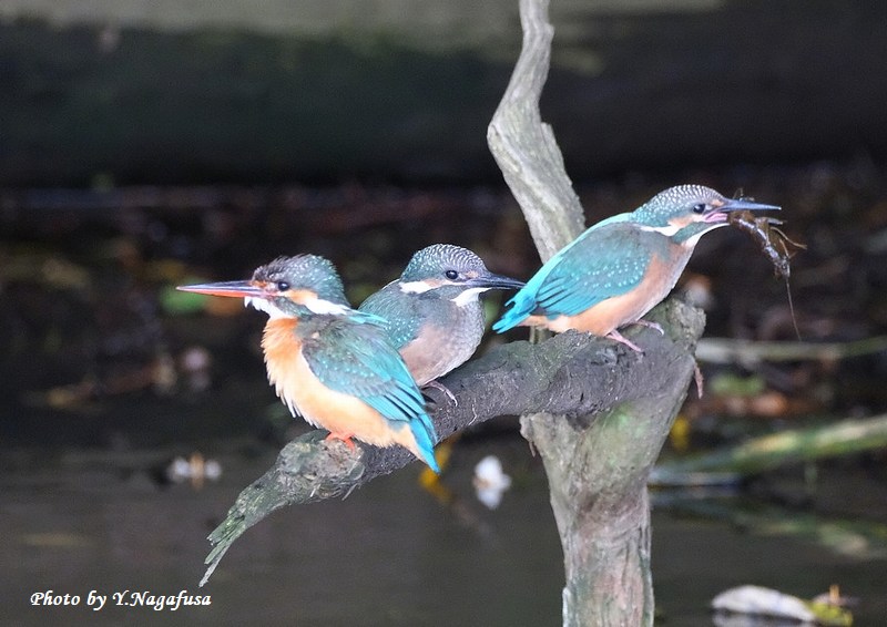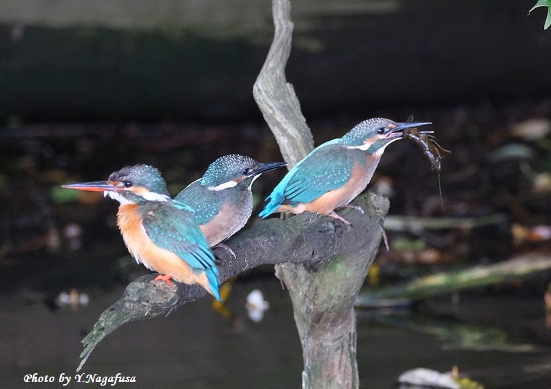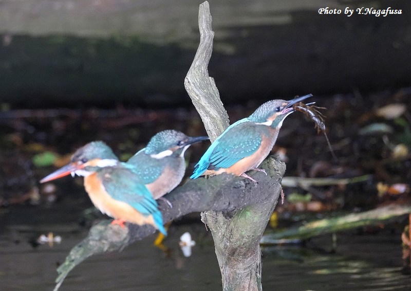 2025年8月5日 カワセミ11 給餌 本日は、カワセミ幼鳥を見てきました。 6月6日撮影のカワセミの続きです。 この日、カワセミ雛にいっぱい遊んでもらいました。 カワセミ親左、右2羽は雛です。mono 物