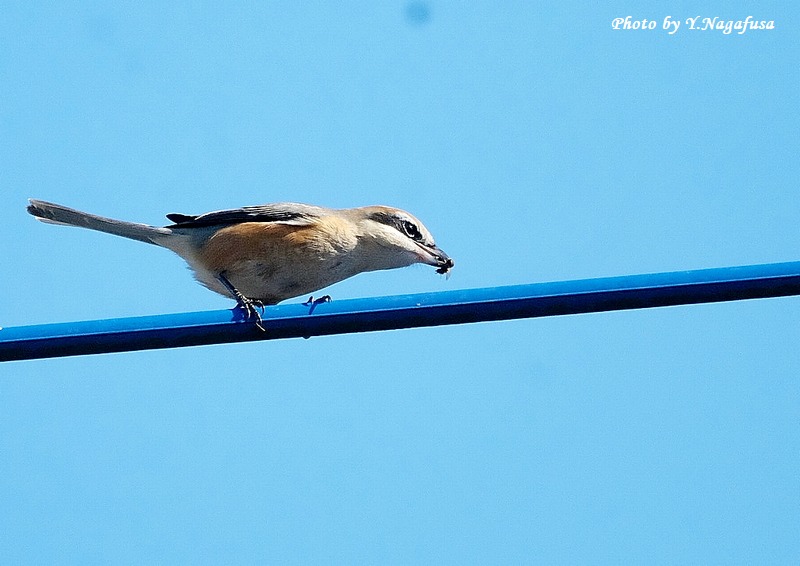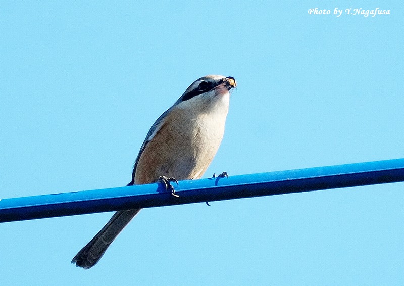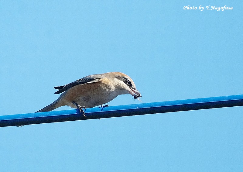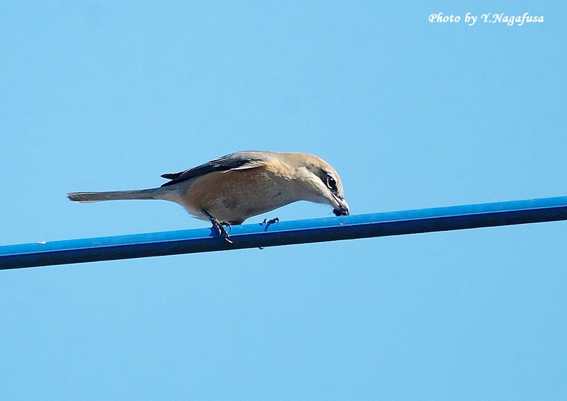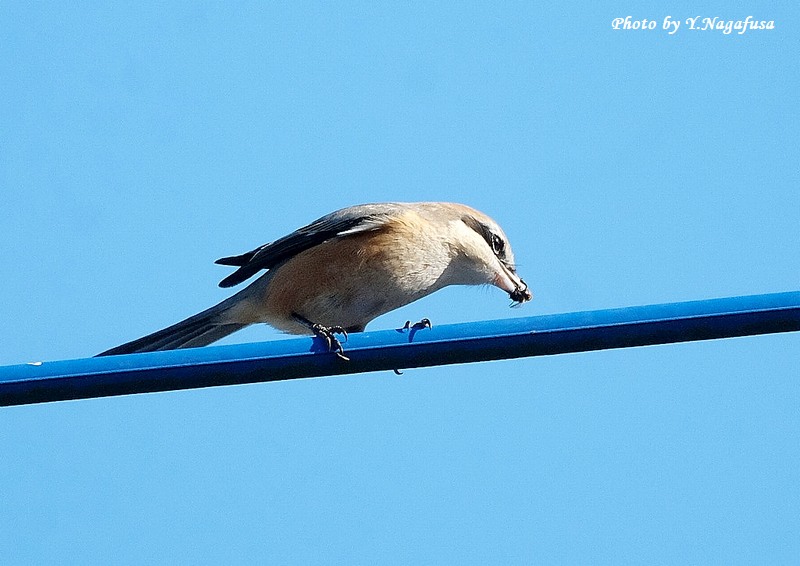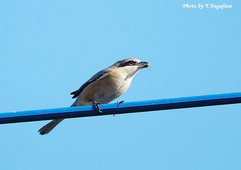 2026年1月8日 モズ♂Ⅱ 採餌 本日もニシオジロビタキを見てきました、まだいました。 2025年12月30日撮影のモズ♂の続きです。 この日、モズ♂が獲物を咥えて電線に来ました。 モズ♂ですmono 物